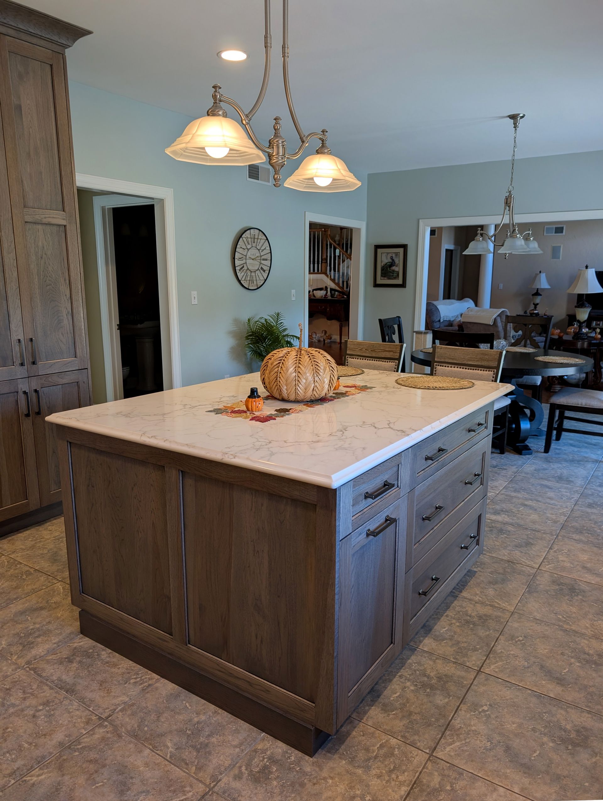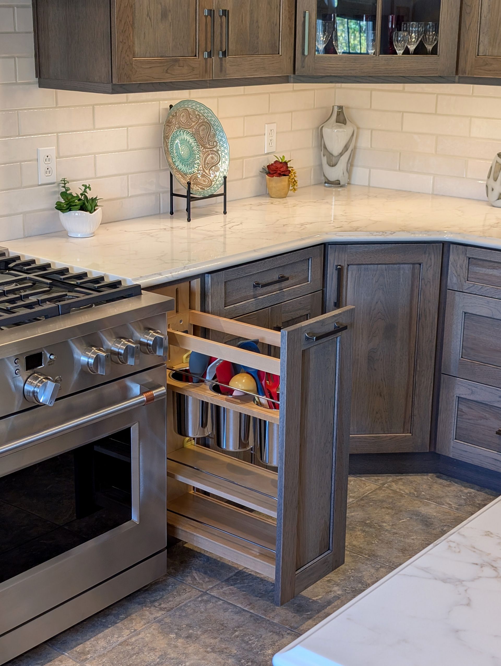 Storage and functionality were just as important as the visual design. The kitchen includes large lazy susans in both corner cabinets, roll trays, baking sheet storage, utensil pull-outs, and custom drawer dividers. Combined with generous counter space throughout the U-shaped layout and island, Teresa now has a kitchen designed to make cooking and entertaining easy.