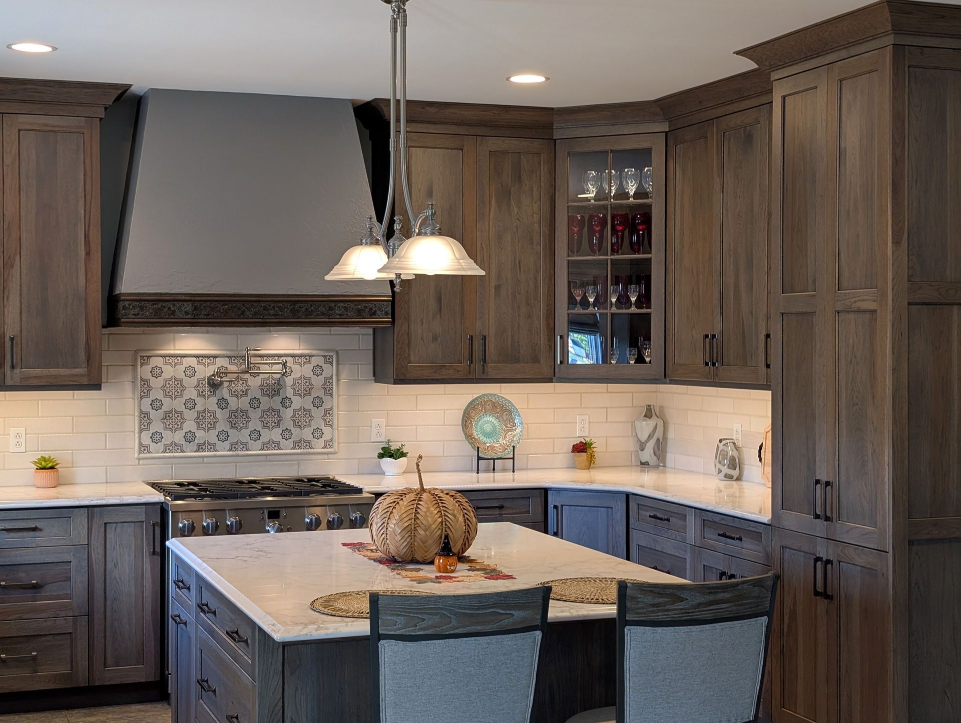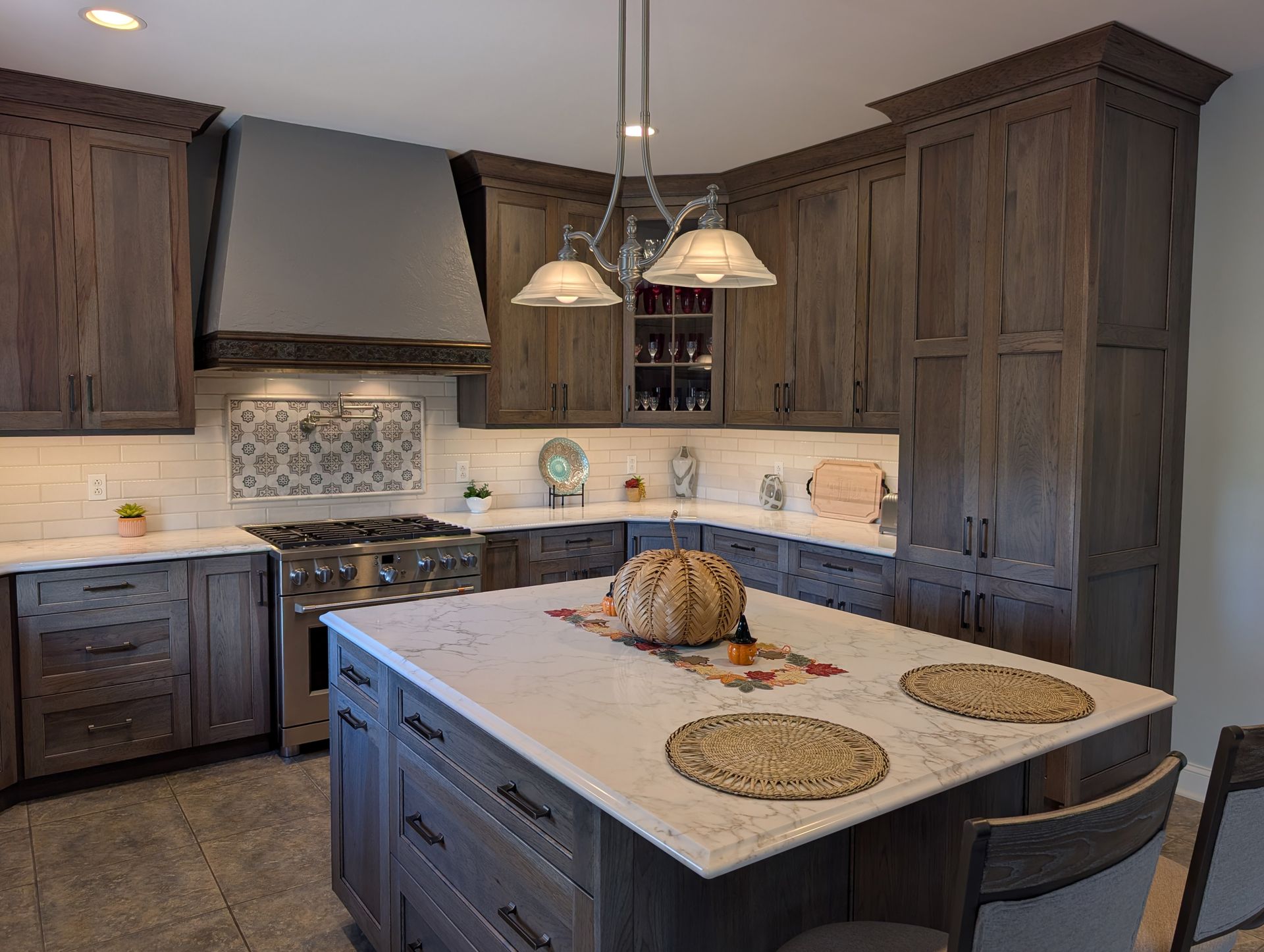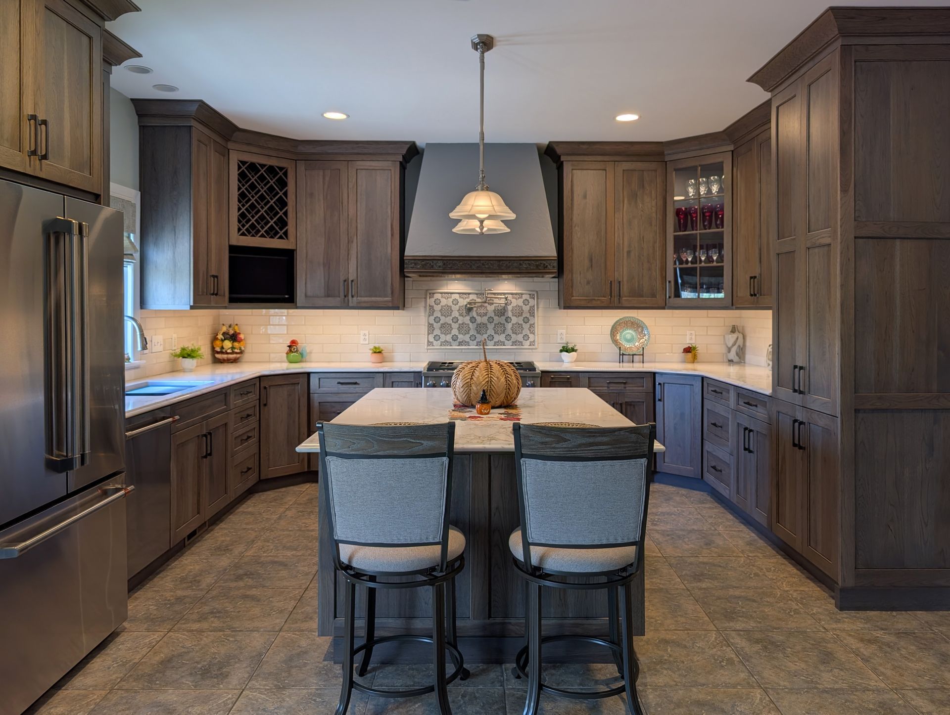 The cabinetry features our Franklin door style in hickory finished in Driftwood stain with an Onyx glaze, giving the kitchen a warm, natural look with beautiful wood grain. Countertops are MSI Calacatta Cinela quartz with an ogee bullnose edge, fabricated by Excel Glass and Granite. The finishing touches include Sullivan pulls by Jeffrey Alexander in brushed pewter, a Pfister Port Haven faucet, and a Karran workstation sink.