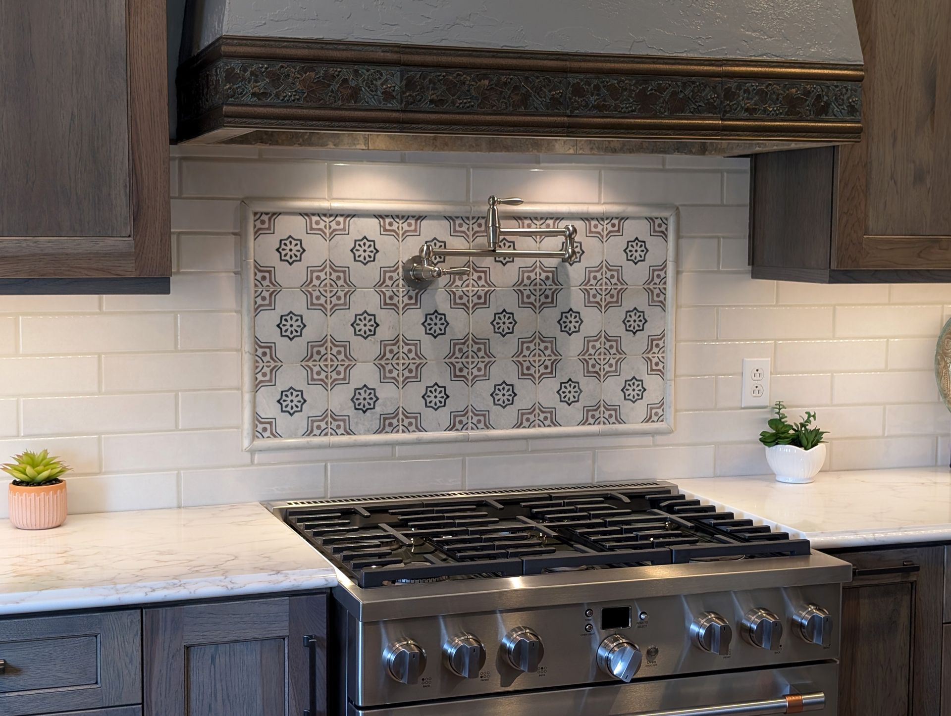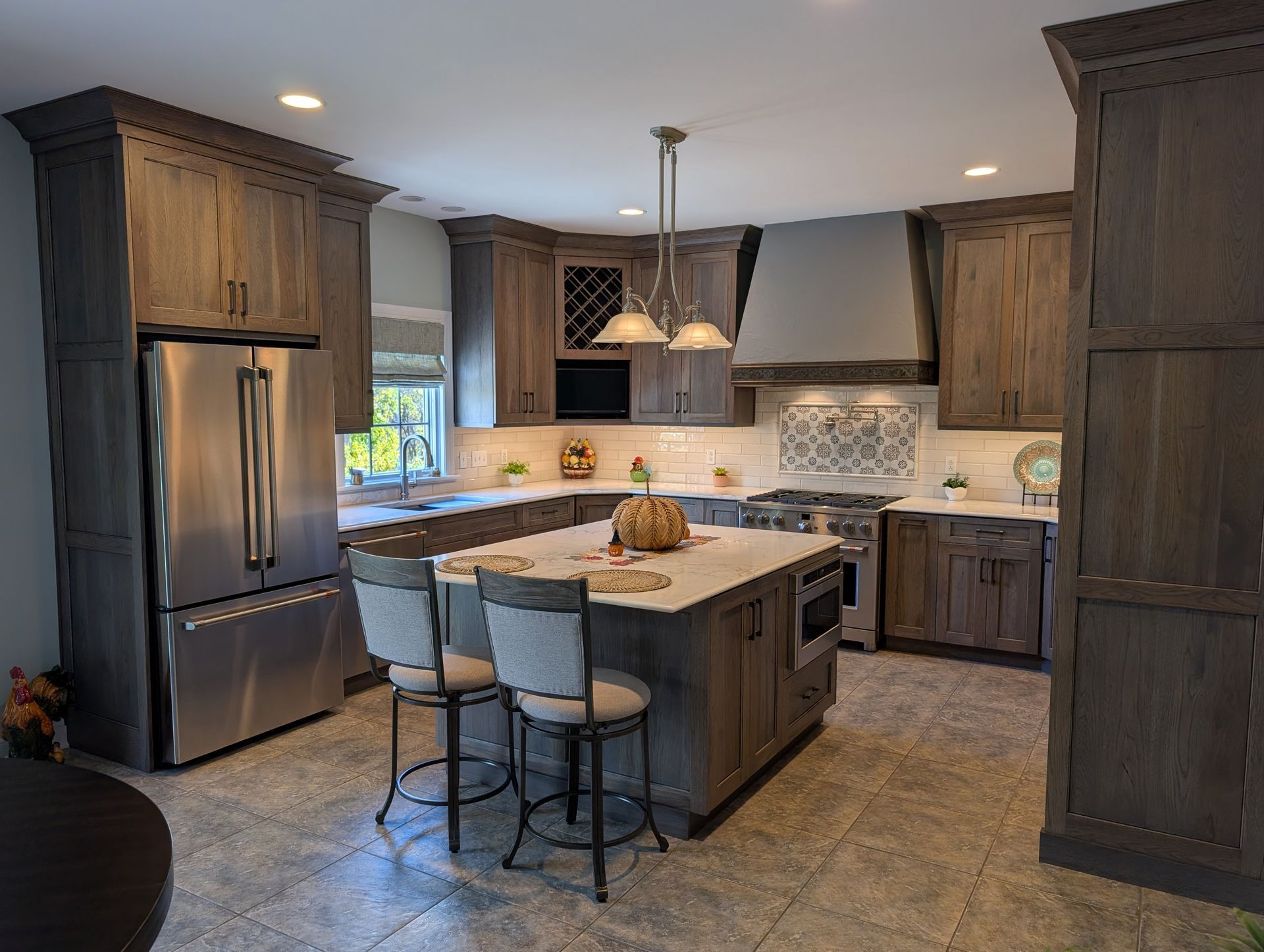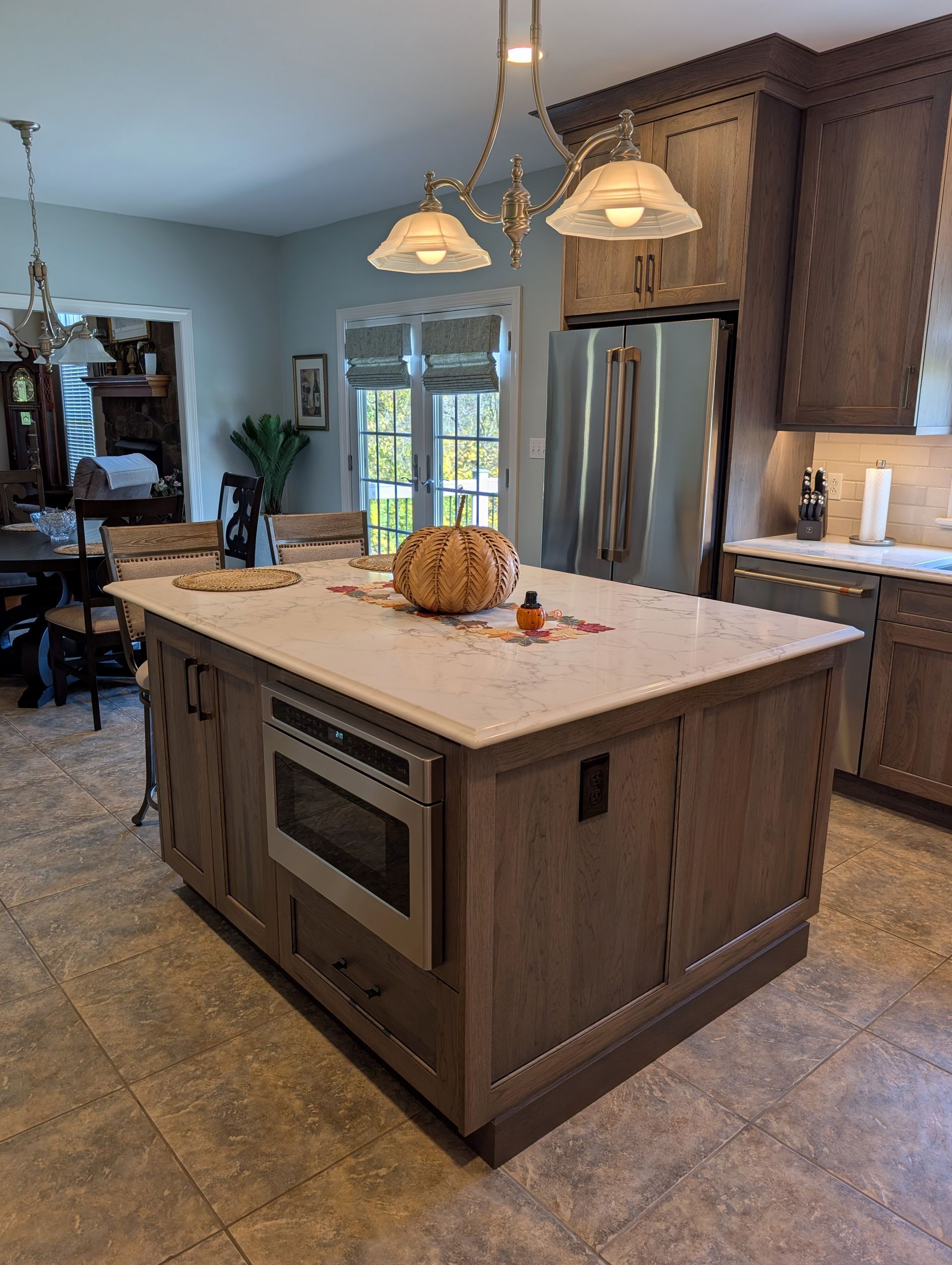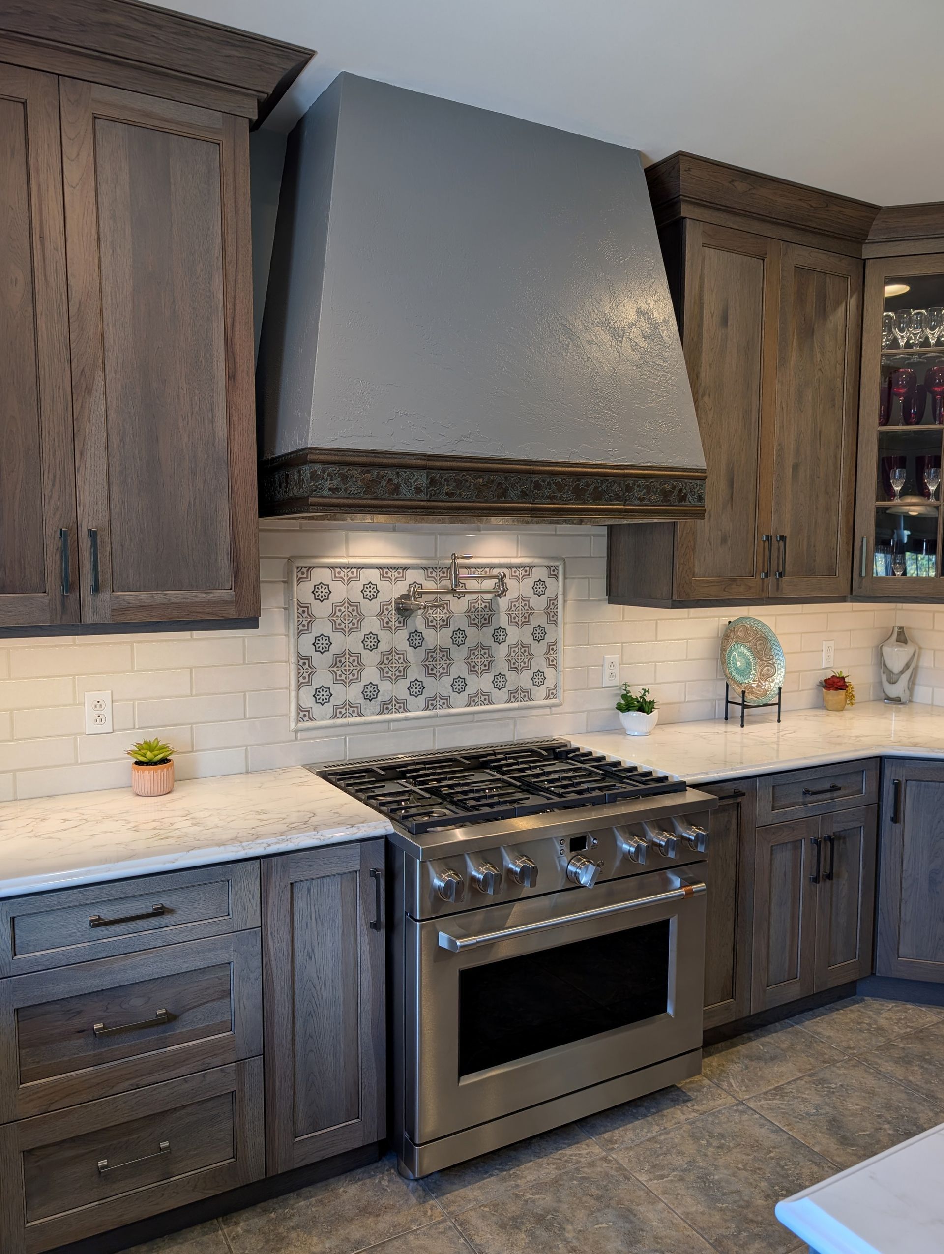 The cabinetry features our Franklin door style in hickory finished in Driftwood stain with an Onyx glaze, giving the kitchen a warm, natural look with beautiful wood grain. Countertops are MSI Calacatta Cinela quartz with an ogee bullnose edge, fabricated by Excel Glass and Granite. The finishing touches include Sullivan pulls by Jeffrey Alexander in brushed pewter, a Pfister Port Haven faucet, and a Karran workstation sink.