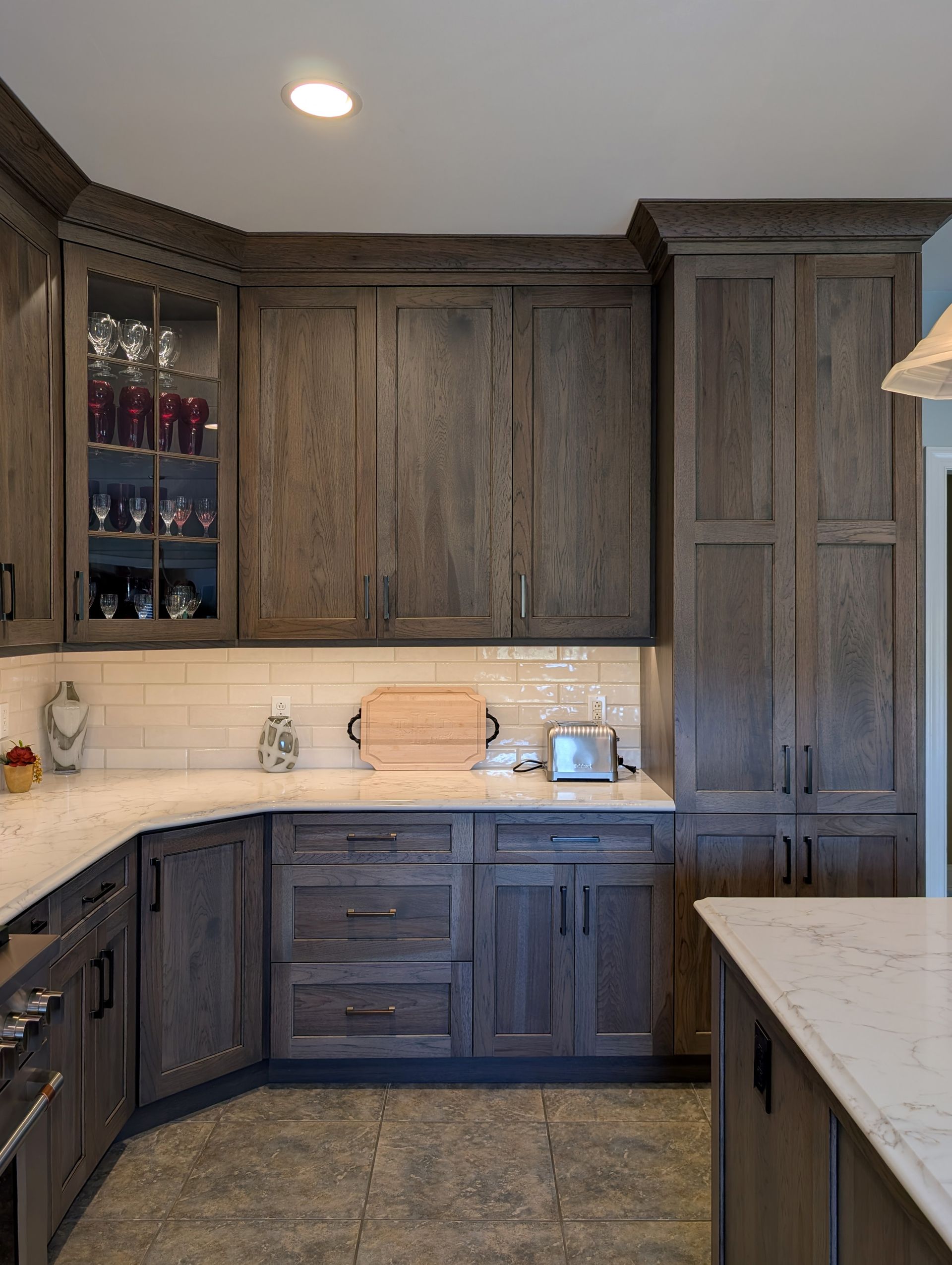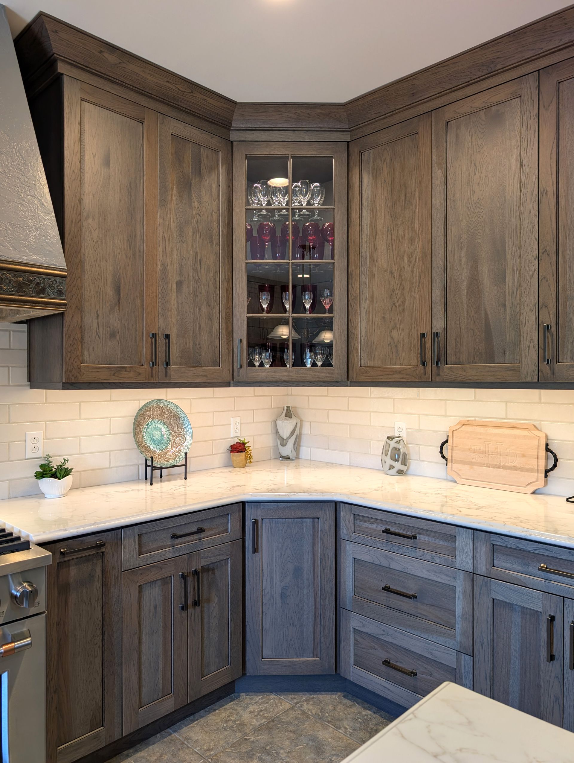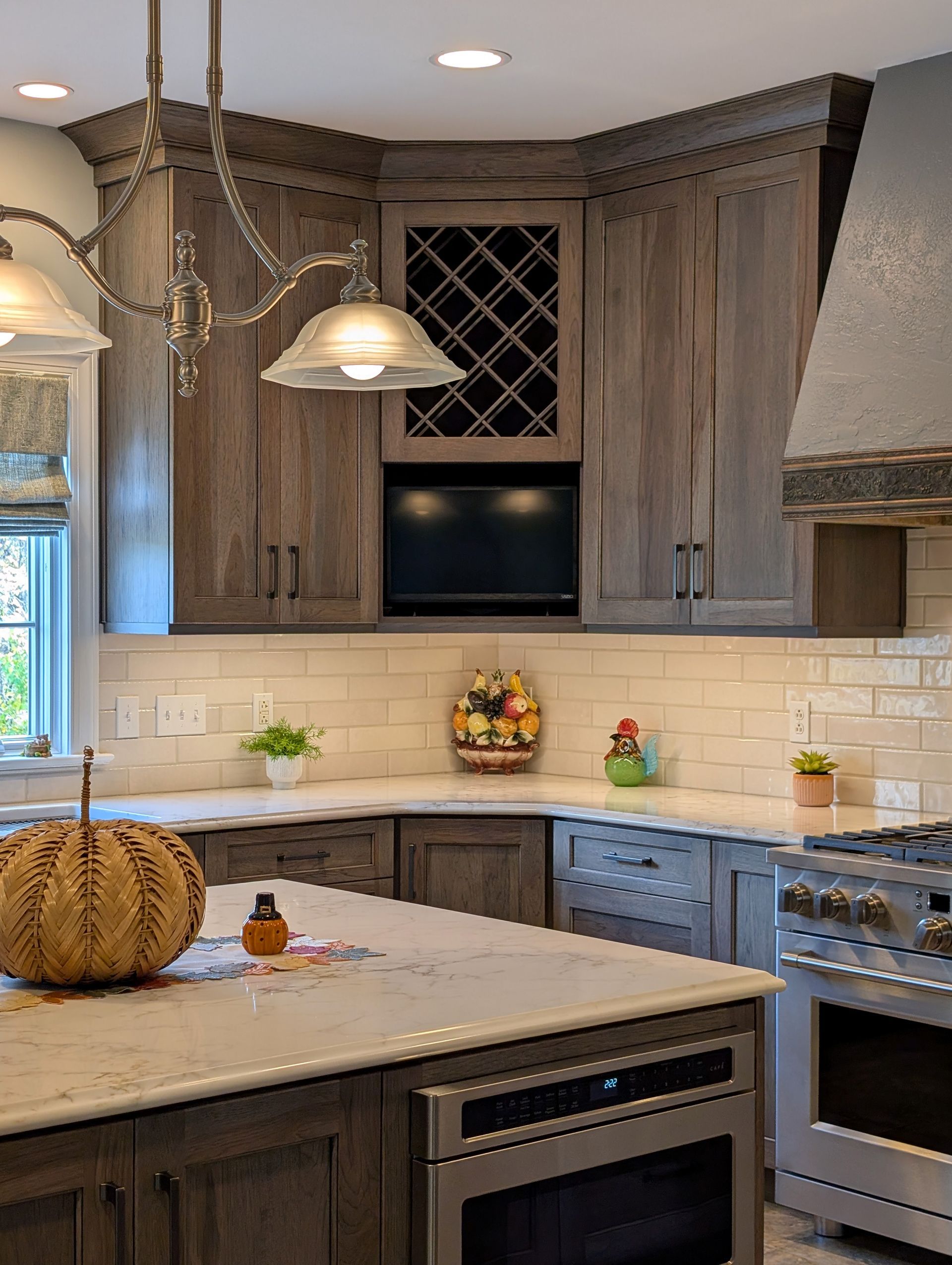 One of the most unique elements in this kitchen is the custom corner cabinet designed to hide the TV in plain sight. We built oversized 30” x 30” wall corner cabinets, allowing a 24-inch television to sit perfectly on a diagonal inside the cabinet. Above it, we added a crossbuck wine rack to complete the look. On the opposite side of the kitchen, the design is mirrored with another large corner cabinet featuring a glass door to display Teresa’s china.