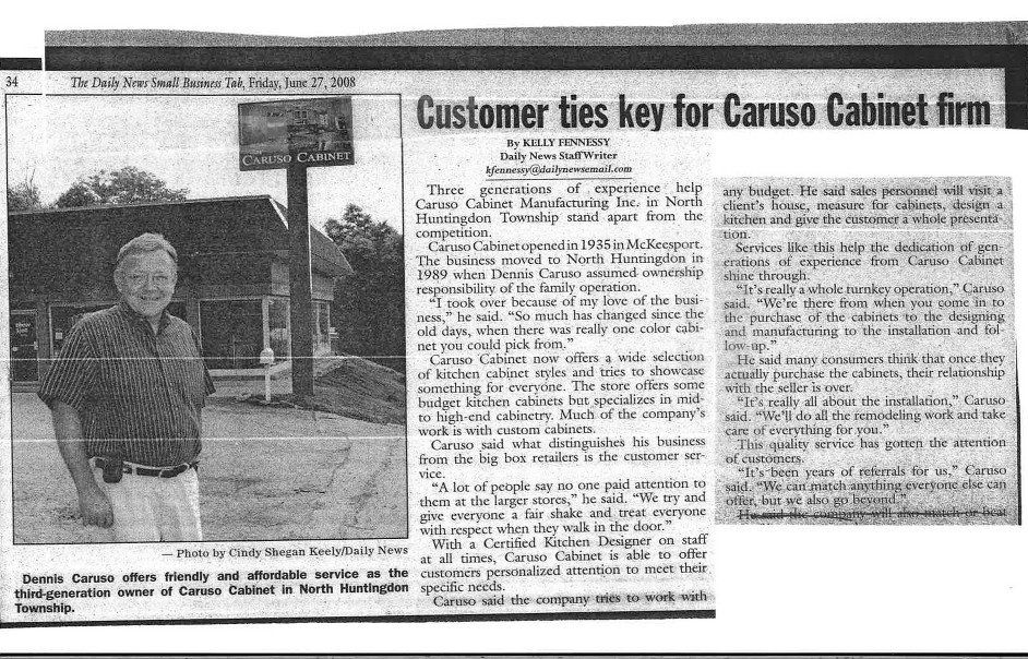 Today, Caruso Cabinet is owned and operated by Dennis Caruso, whose grandfather originally started the company in 1935 in McKeesport. His father took over the business from the 1950s through 1970s, and Dennis has been running it since the early 1980s.