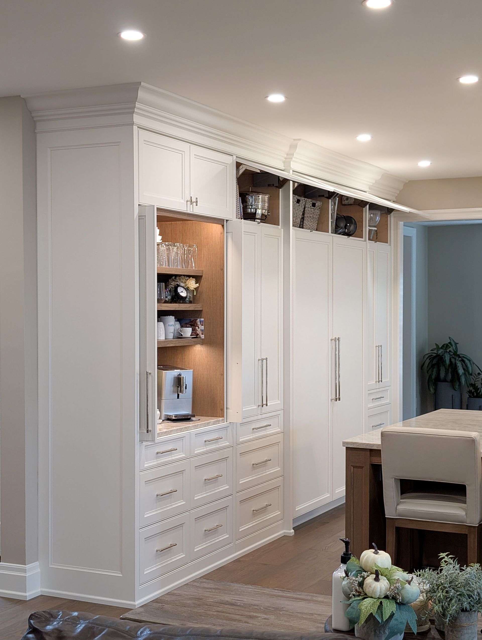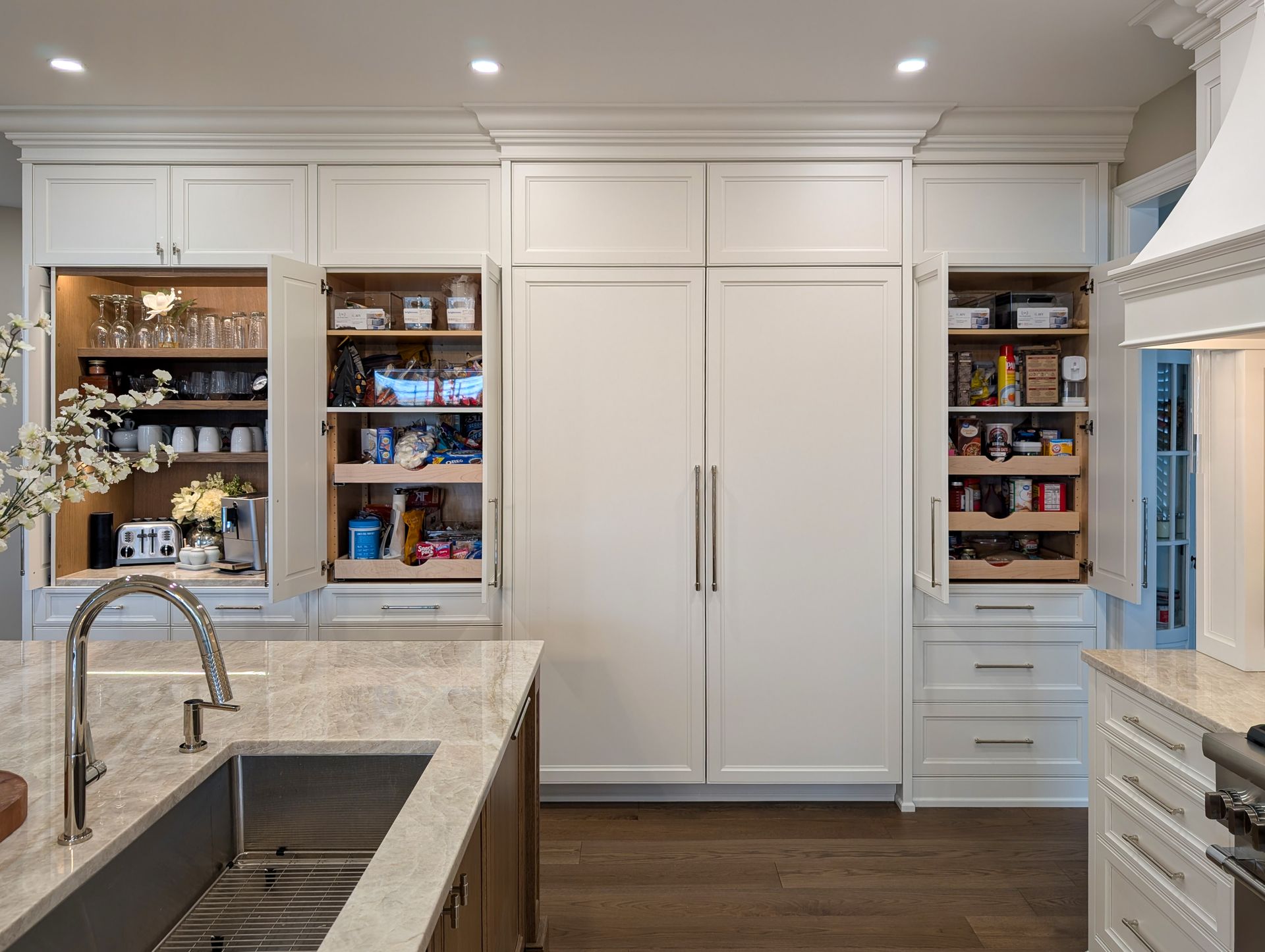 - Refrigerator Wall – Two 30-inch paneled Signature Suite refrigerator and freezer columns, a pocket door coffee station, two pantry cabinets with roll trays, and push-to-open uppers.