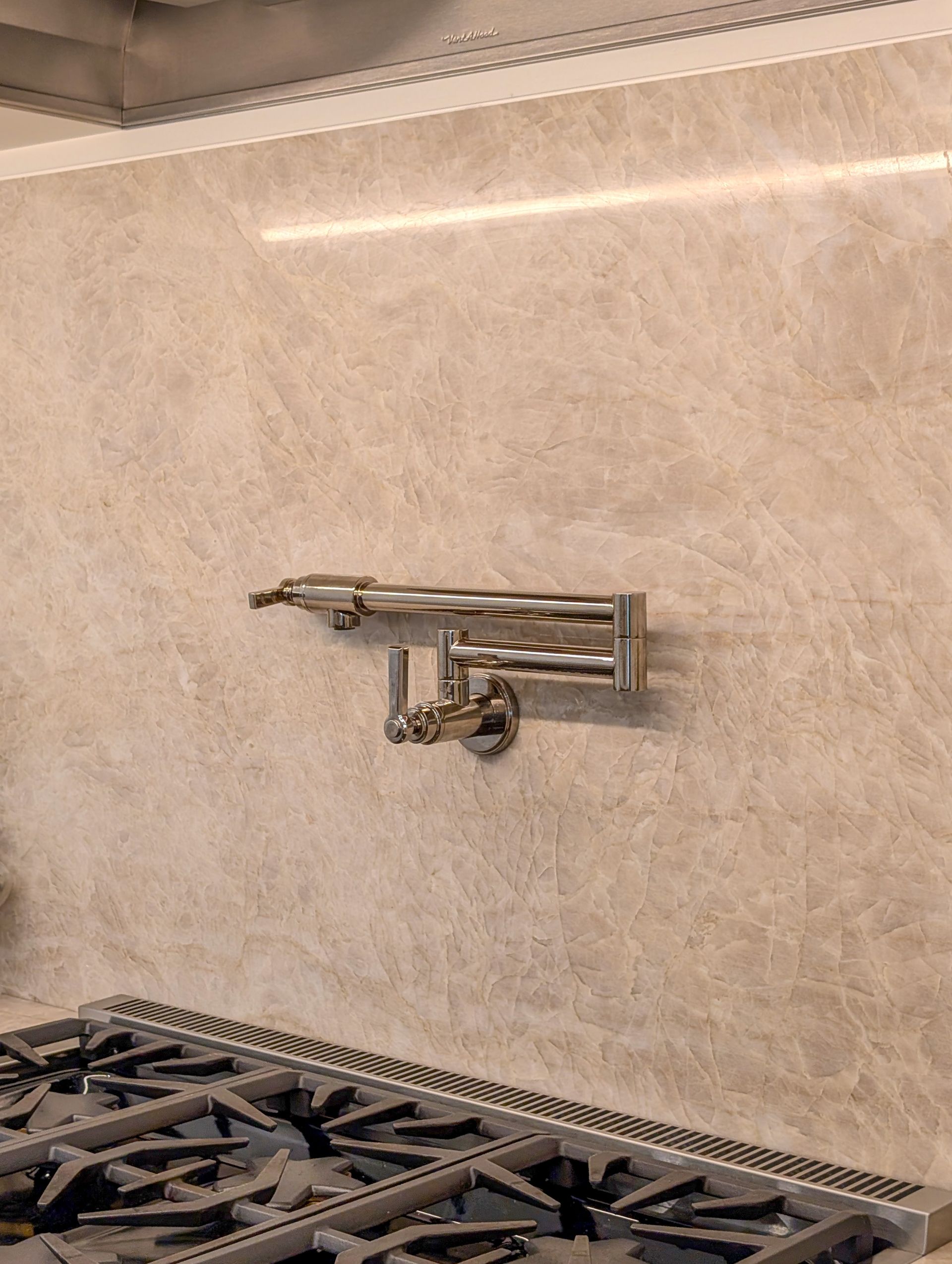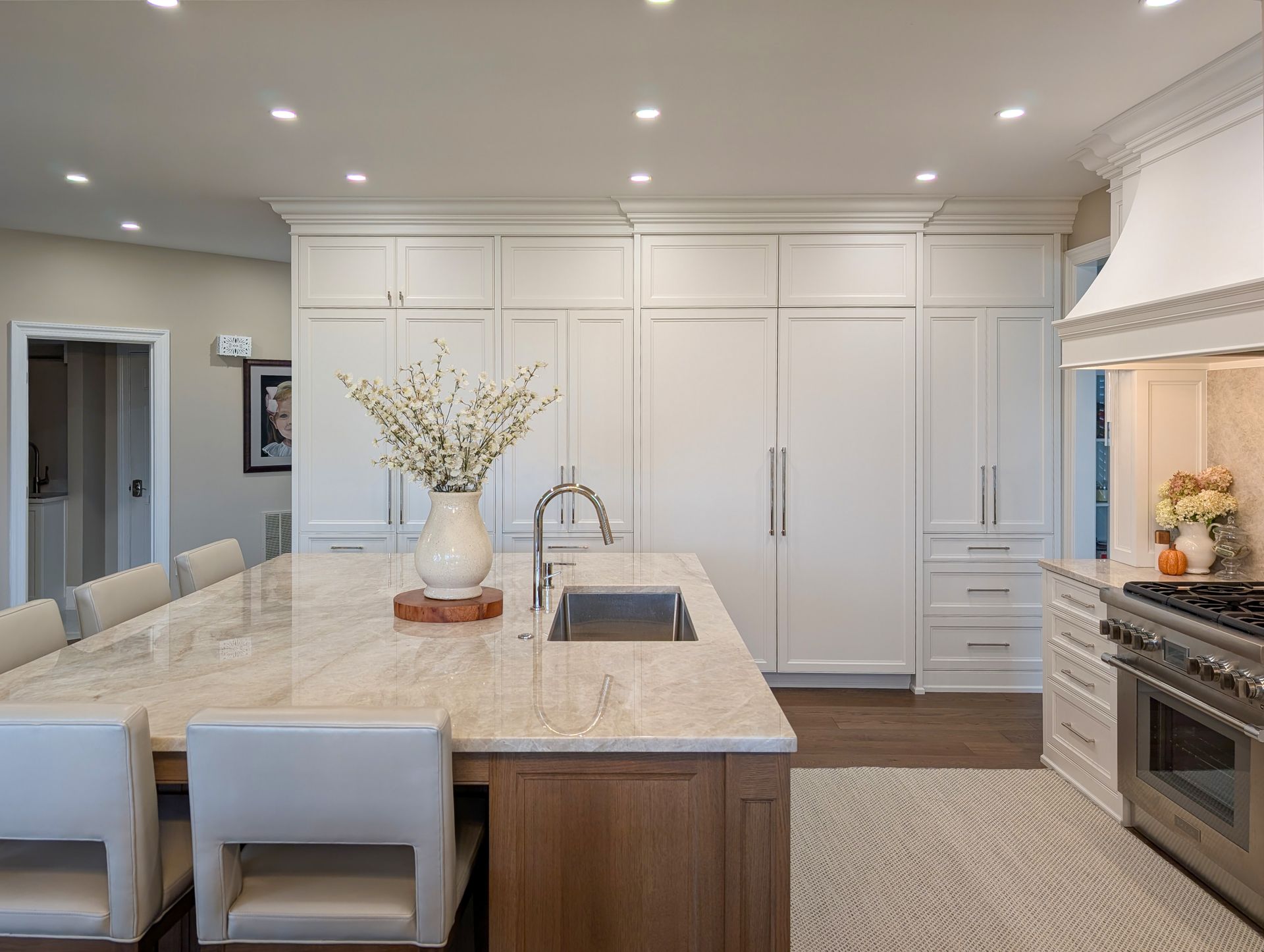 A highlight of the kitchen is the six-foot hood, crafted by Icon Kitchens in Mississauga, ON, Canada. Kristina wanted her kitchen to echo her cousin’s in Canada, right down to the details. The hood was shipped raw to our shop and custom-finished to match the cabinetry perfectly, making it both a functional statement and a personal connection.