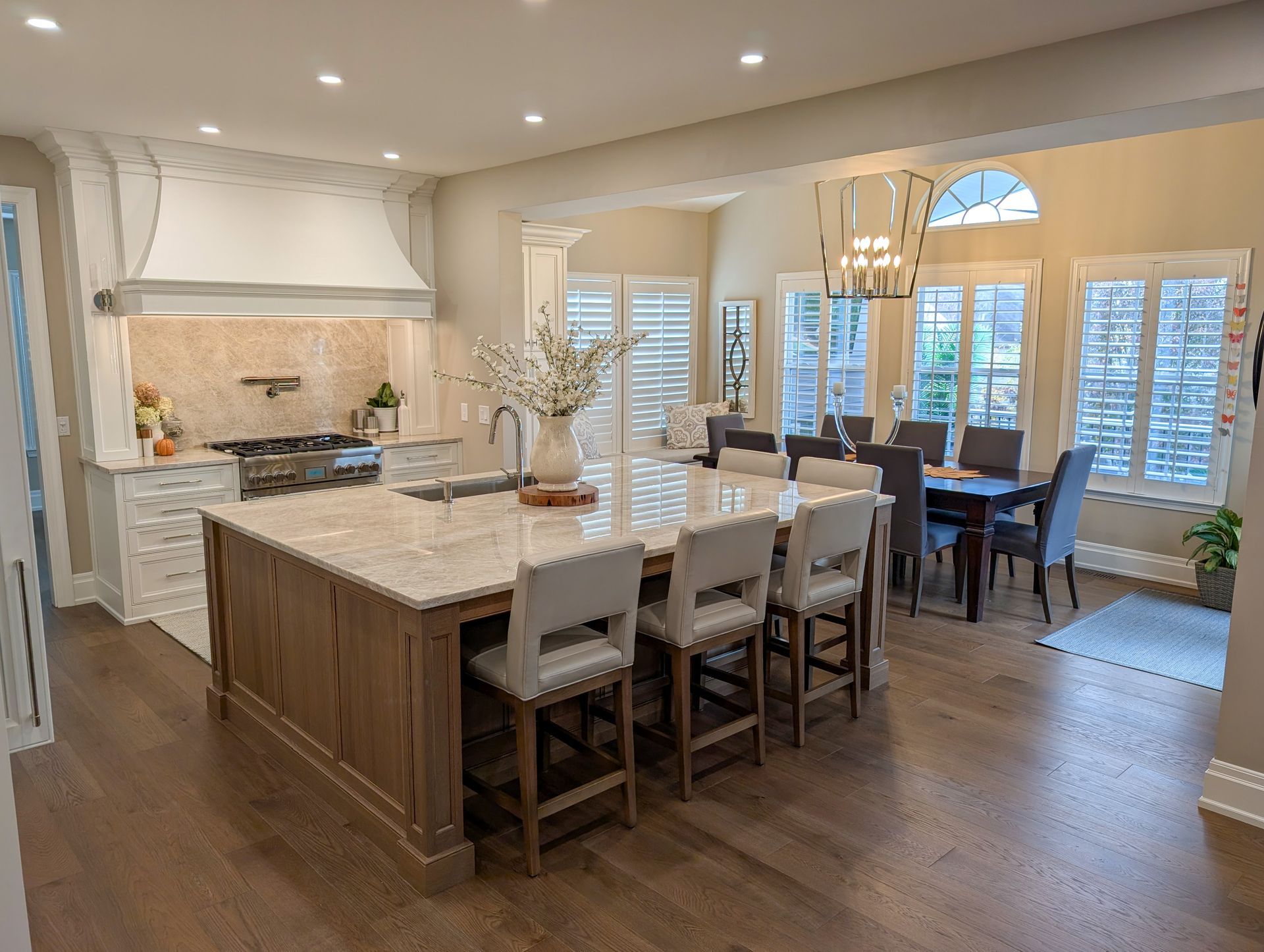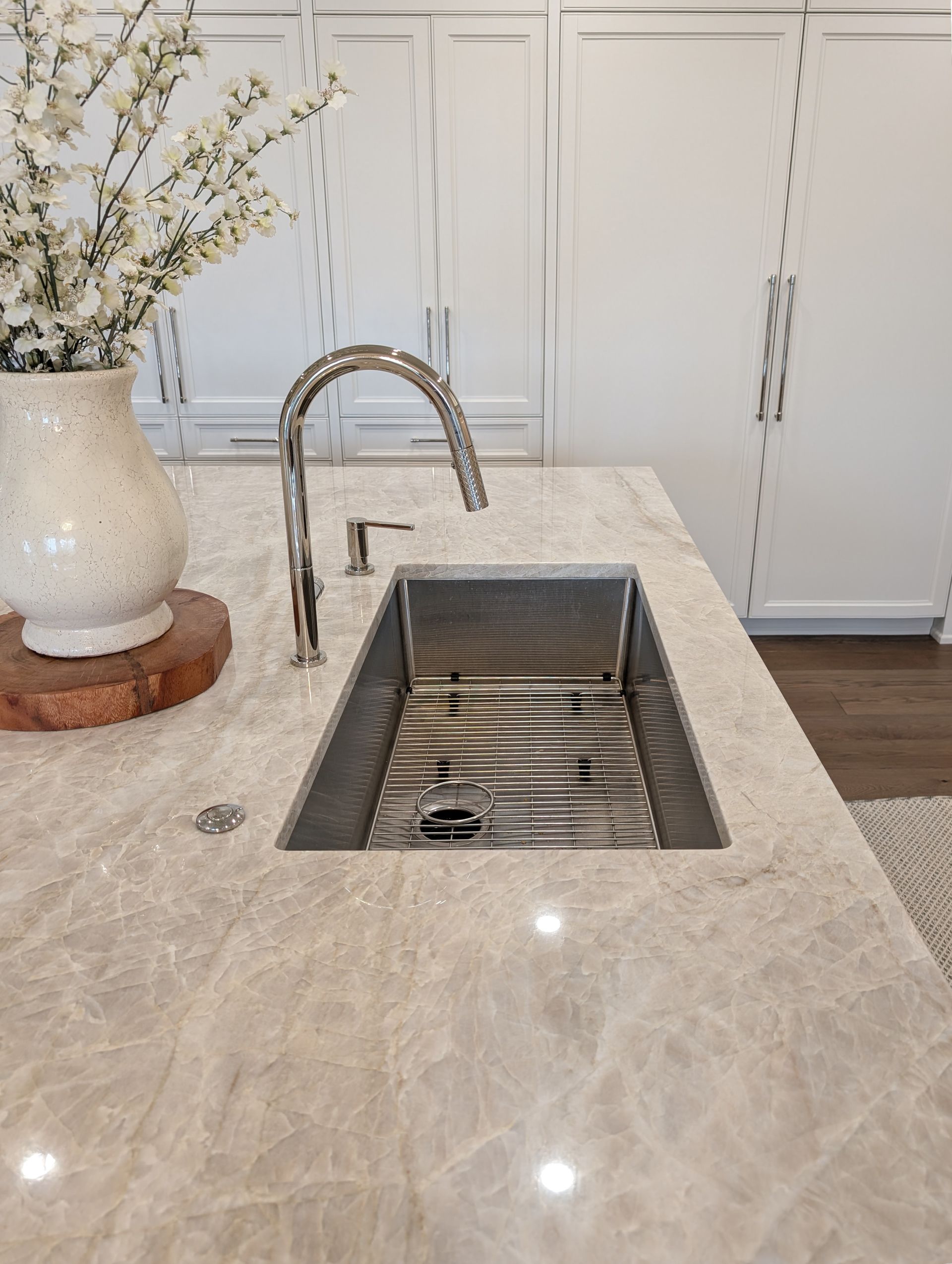 Kristina wanted the biggest island that would fit without a seam in the quartzite. We worked backwards from her Taj Mahal quartzite slab, ensuring the island size matched her vision while keeping the beauty of a seamless top.