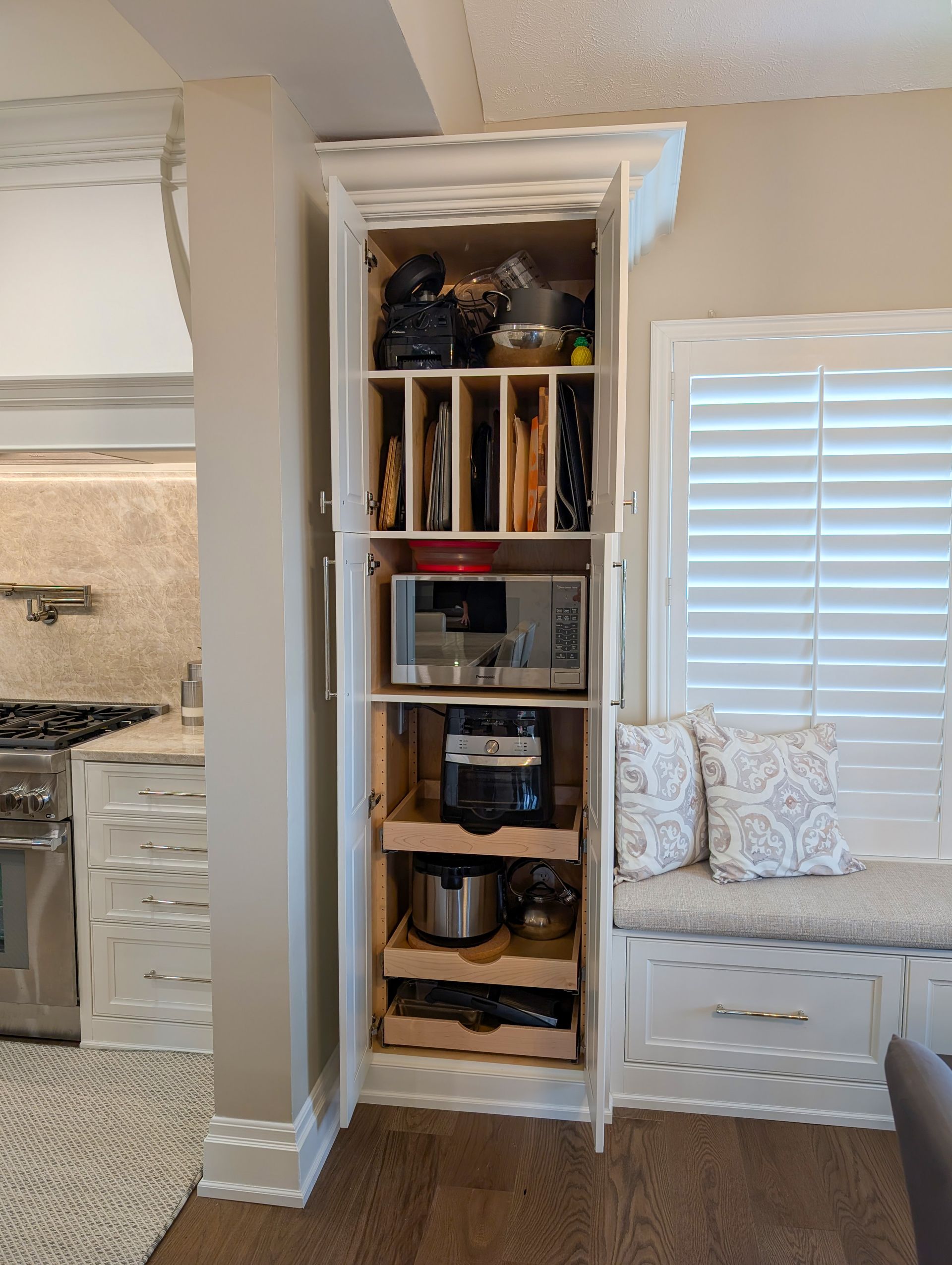 - Morning Room – A built-in pantry, microwave storage, and an integrated window seat with drawers.