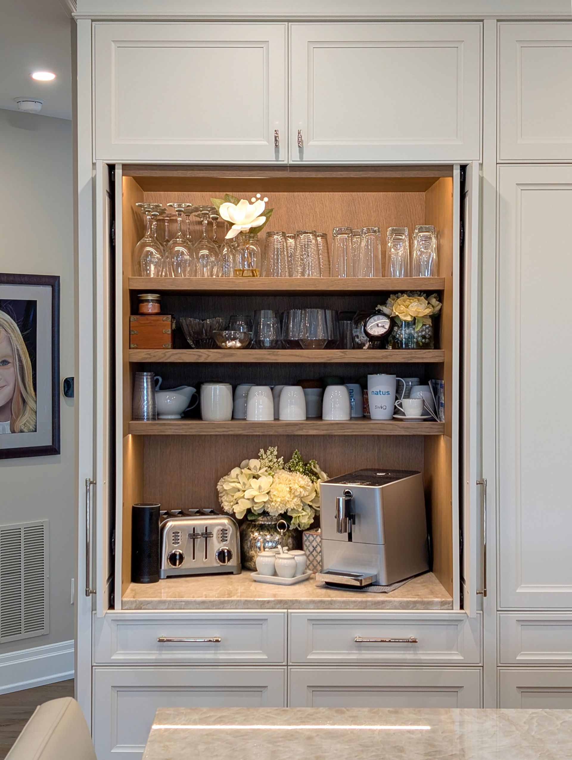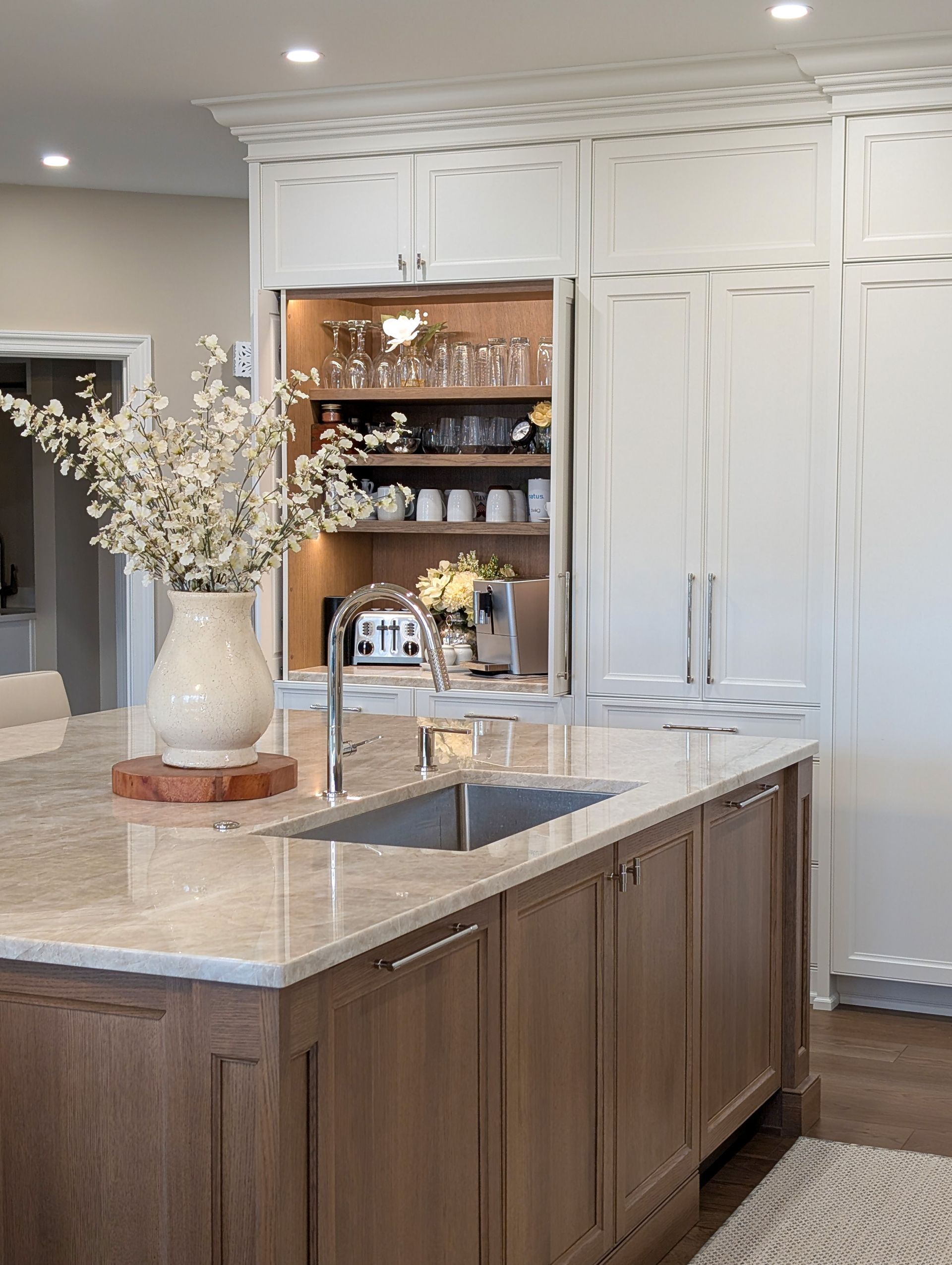 A hidden pocket door coffee station was also integrated to keep small appliances tucked away. Kristina’s priority was a clutter-free design, and our custom cabinetry delivered.