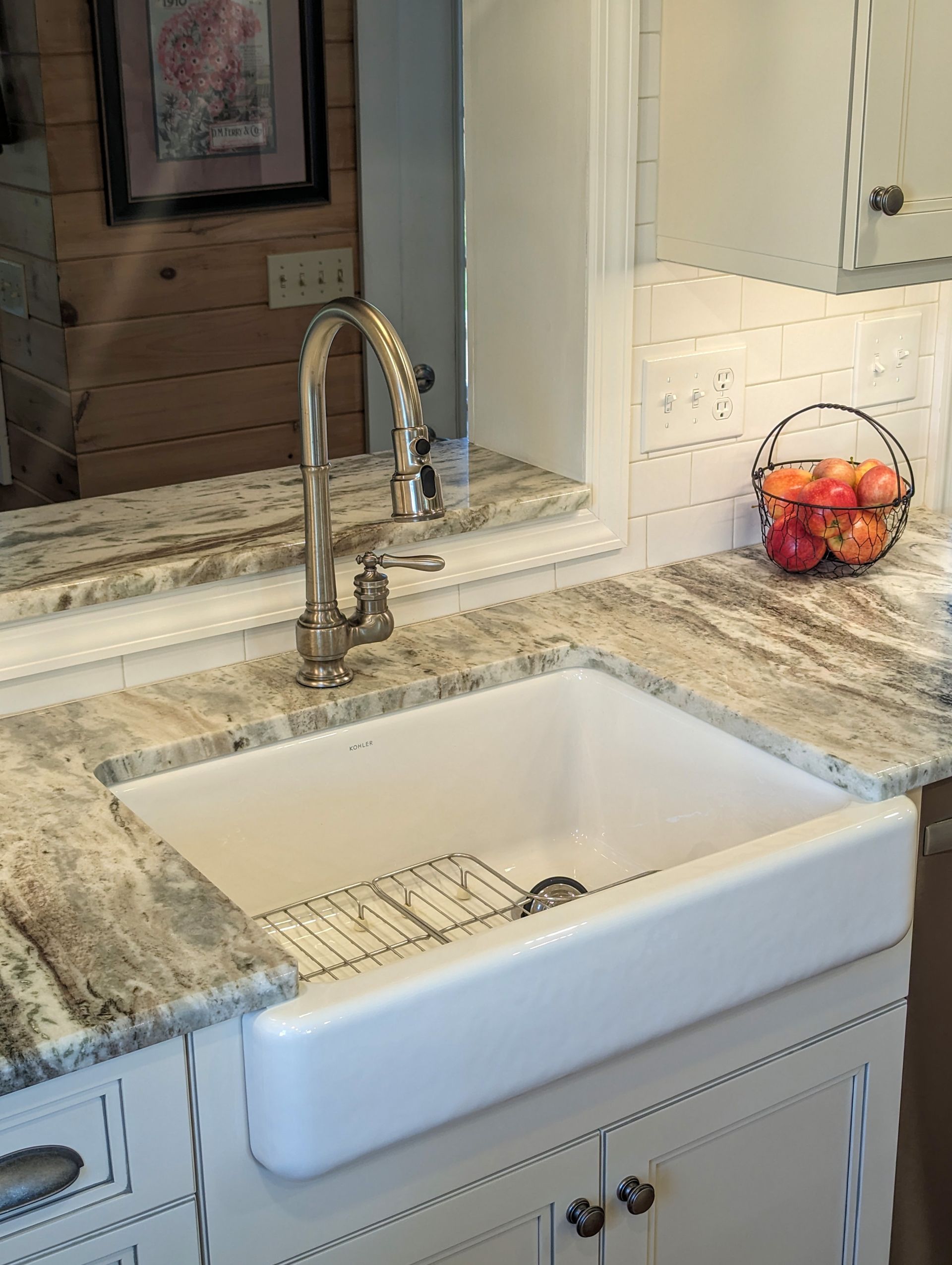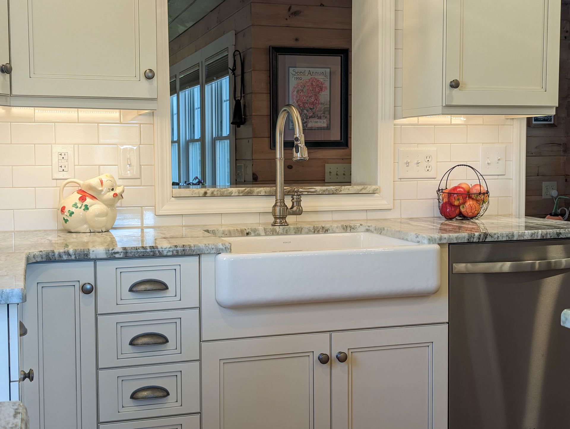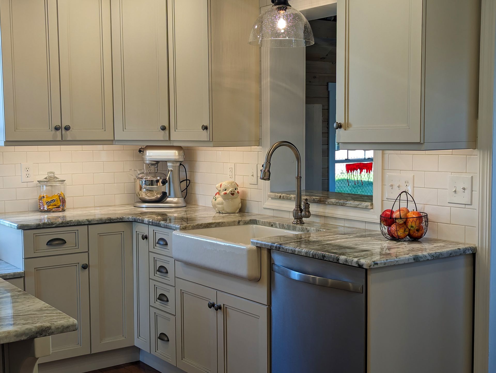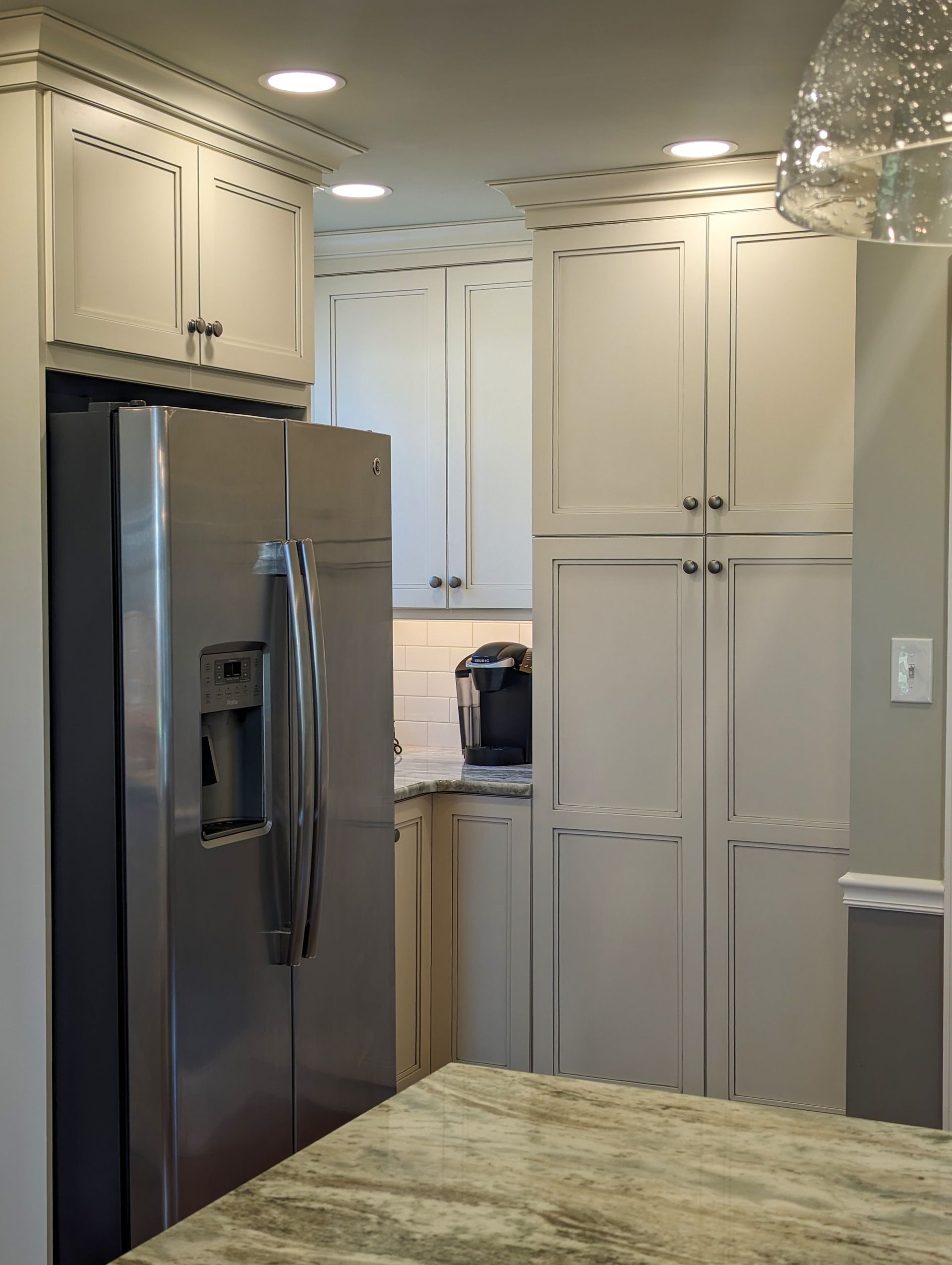 The design features our Savannah door style in Crystal White with a Pewter glaze, paired with pewter antique cup pulls and knobs. A porcelain farmhouse sink and Kohler faucet reinforce the farmhouse aesthetic, while the well-placed pantry and refrigerator area add functionality and serve as a charming coffee bar. Fantasy Brown granite countertops tie everything together, complementing the cabinetry and the refinished hardwood floors.