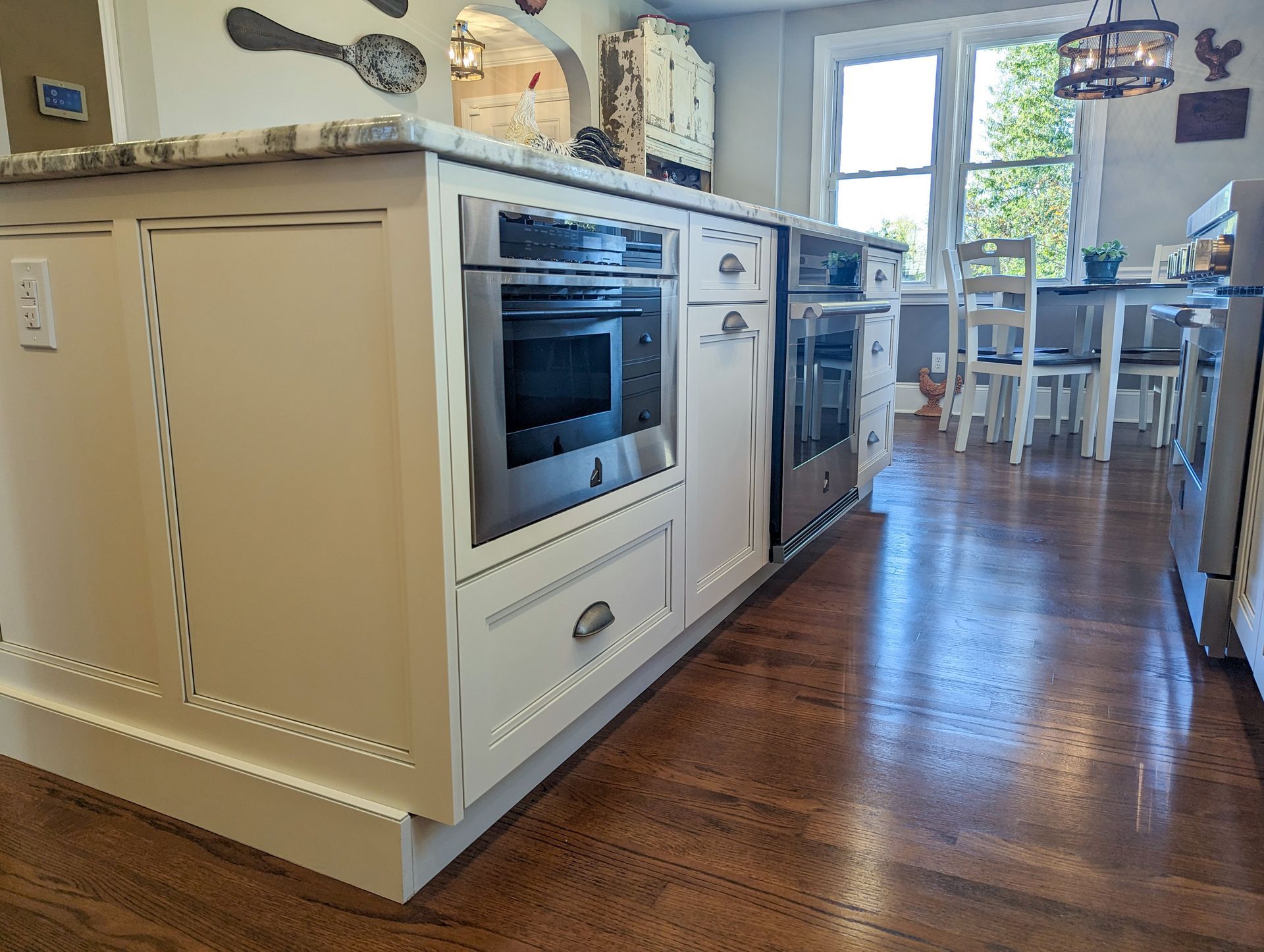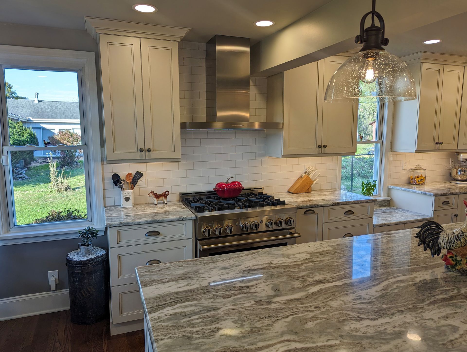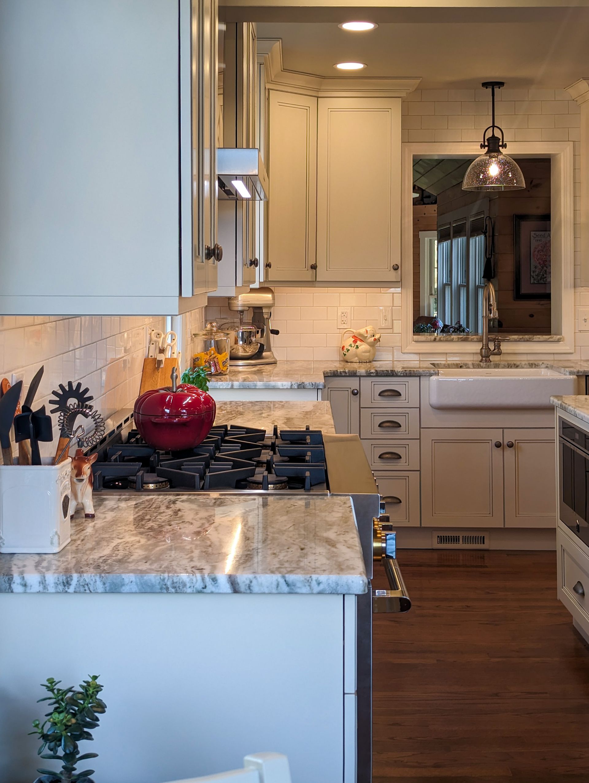 We installed a structural beam to expand into the dining area, creating space for a large island with seating for four, a microwave drawer, an oven, and our popular double pull-out trash cabinet. On the opposite side, a 36” slide-in range with stainless steel hood gives the kitchen a professional touch. Custom cabinetry was tailored around the room’s original low windows to keep the home’s charm intact.
