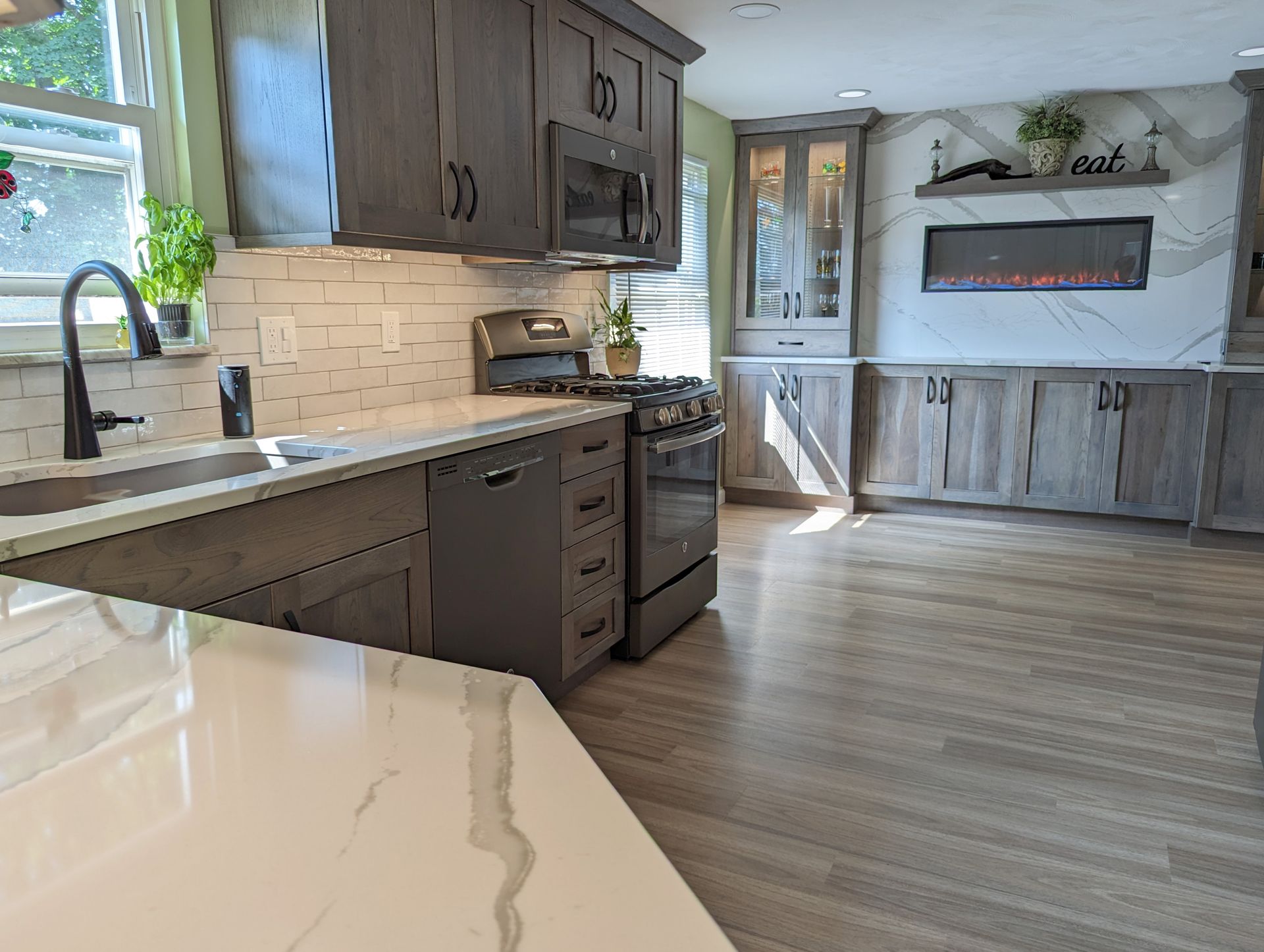 To maximize the space, the layout includes clever storage solutions and a custom accent wall that doubles as a focal point. A recessed electric fireplace set into a quartz high splash brings cozy charm and makes this kitchen unique.