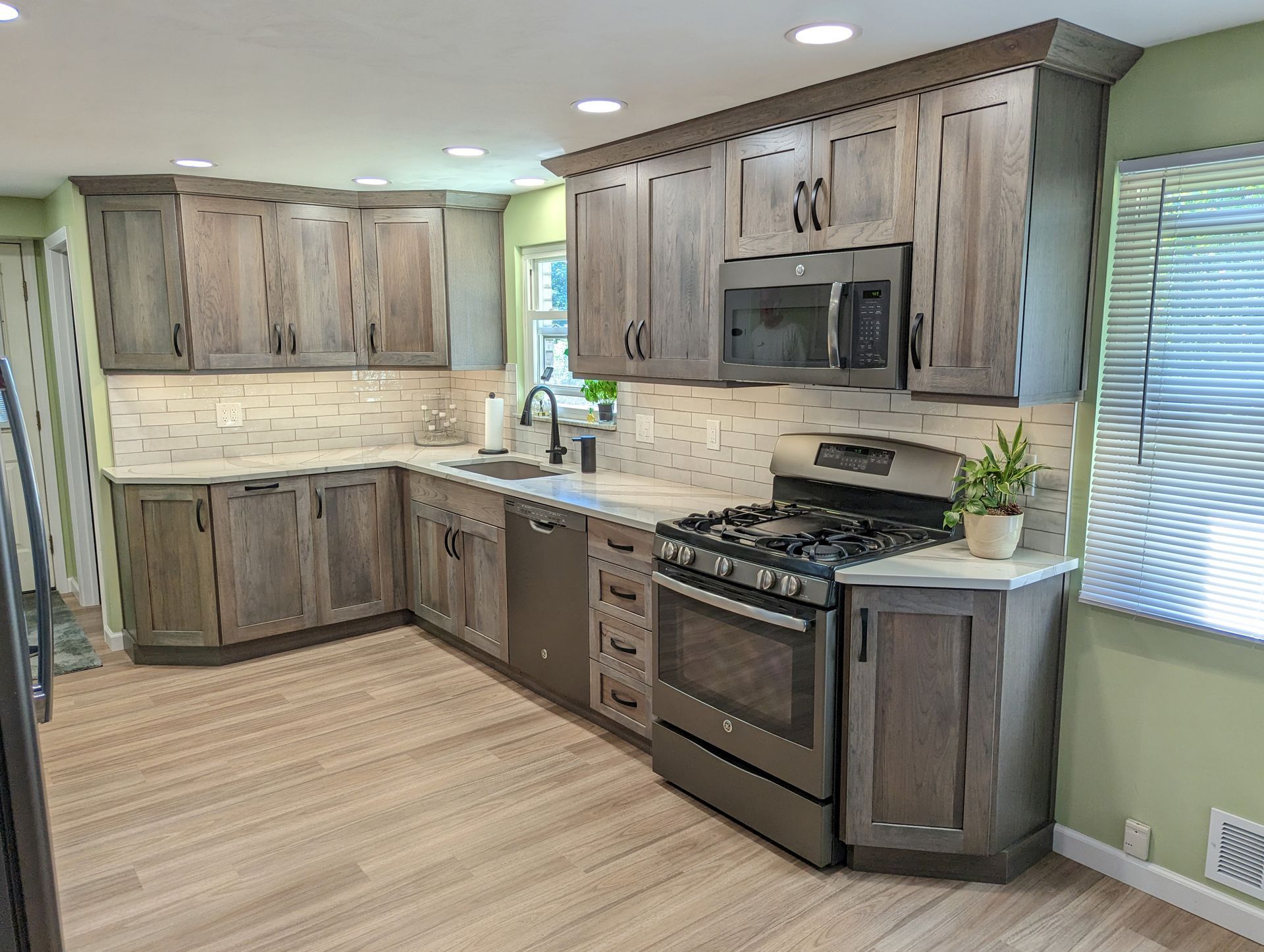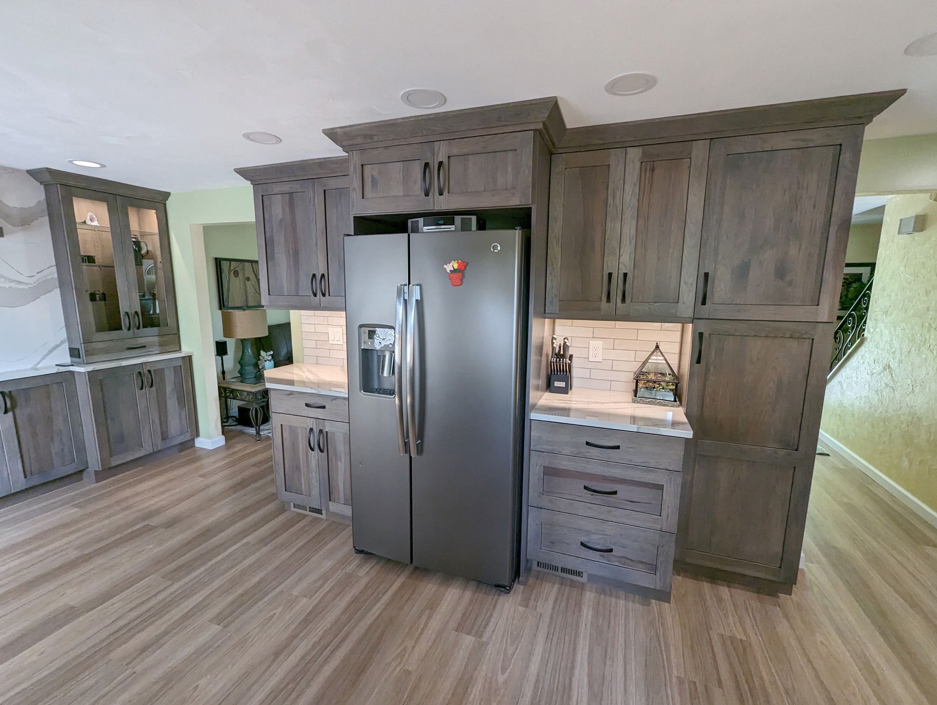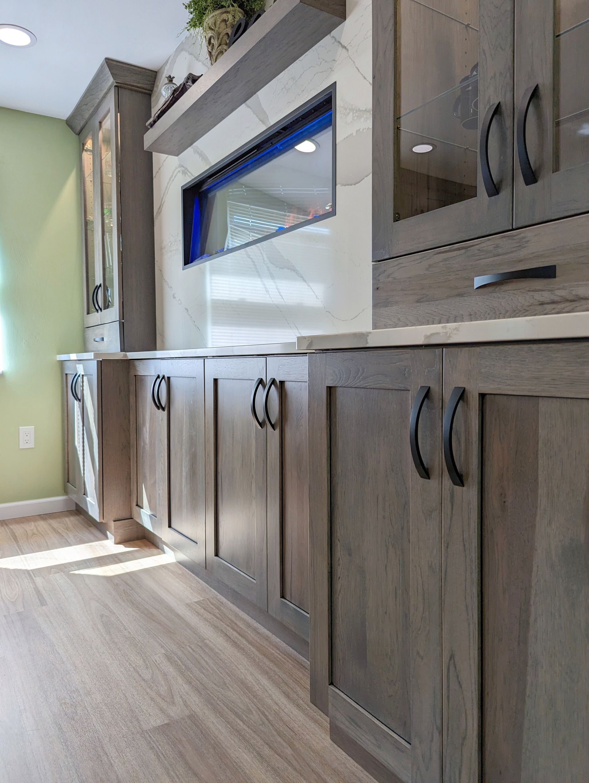 The cabinetry is crafted in hickory with a driftwood stain and onyx glaze, giving the space warmth, depth, and rich natural character. This cabinetry anchors the design and pairs beautifully with Cambria Brittanicca Warm quartz countertops, known for their captivating veining and timeless elegance.