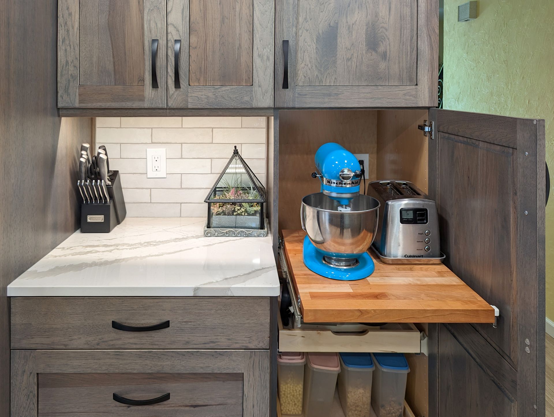 Every detail in Shirley’s kitchen blends practicality with design flair, from the illuminated accent wall to the efficient storage upgrades.