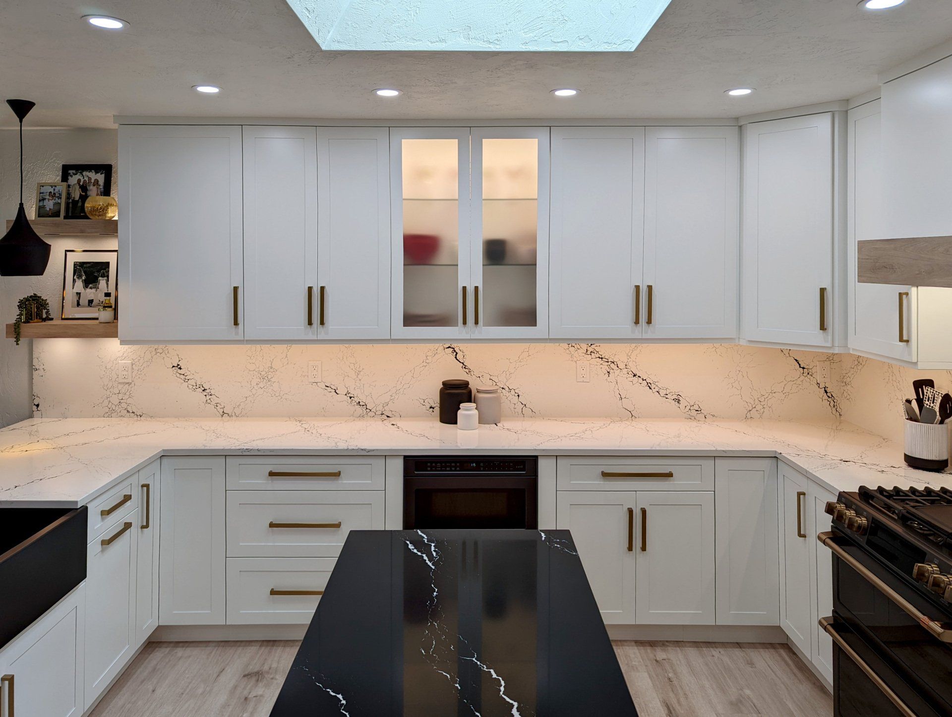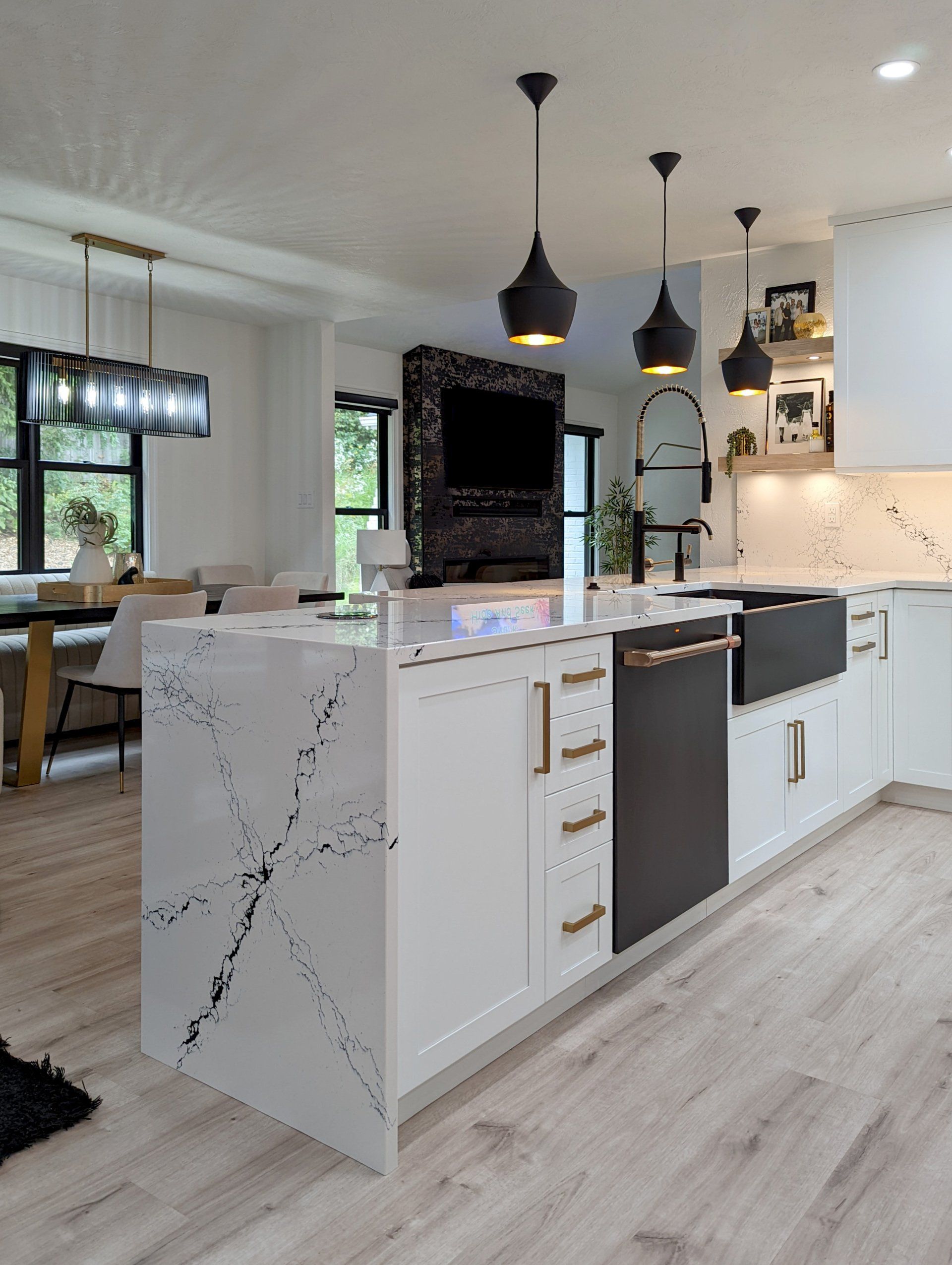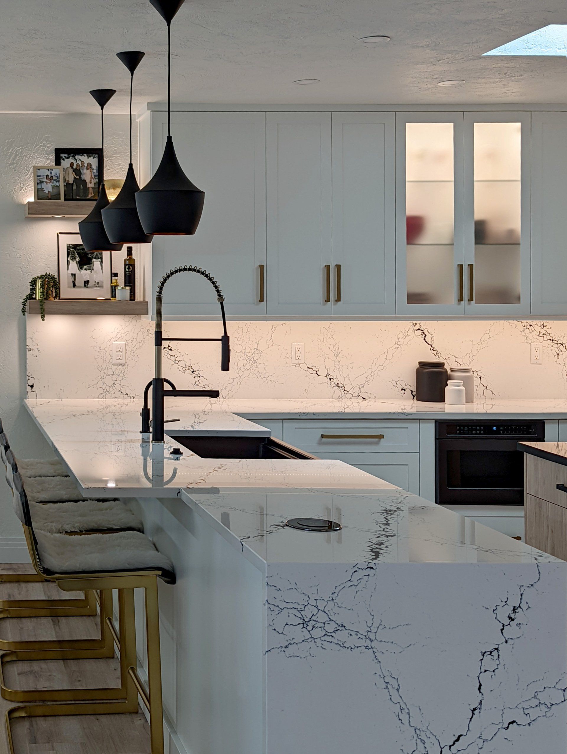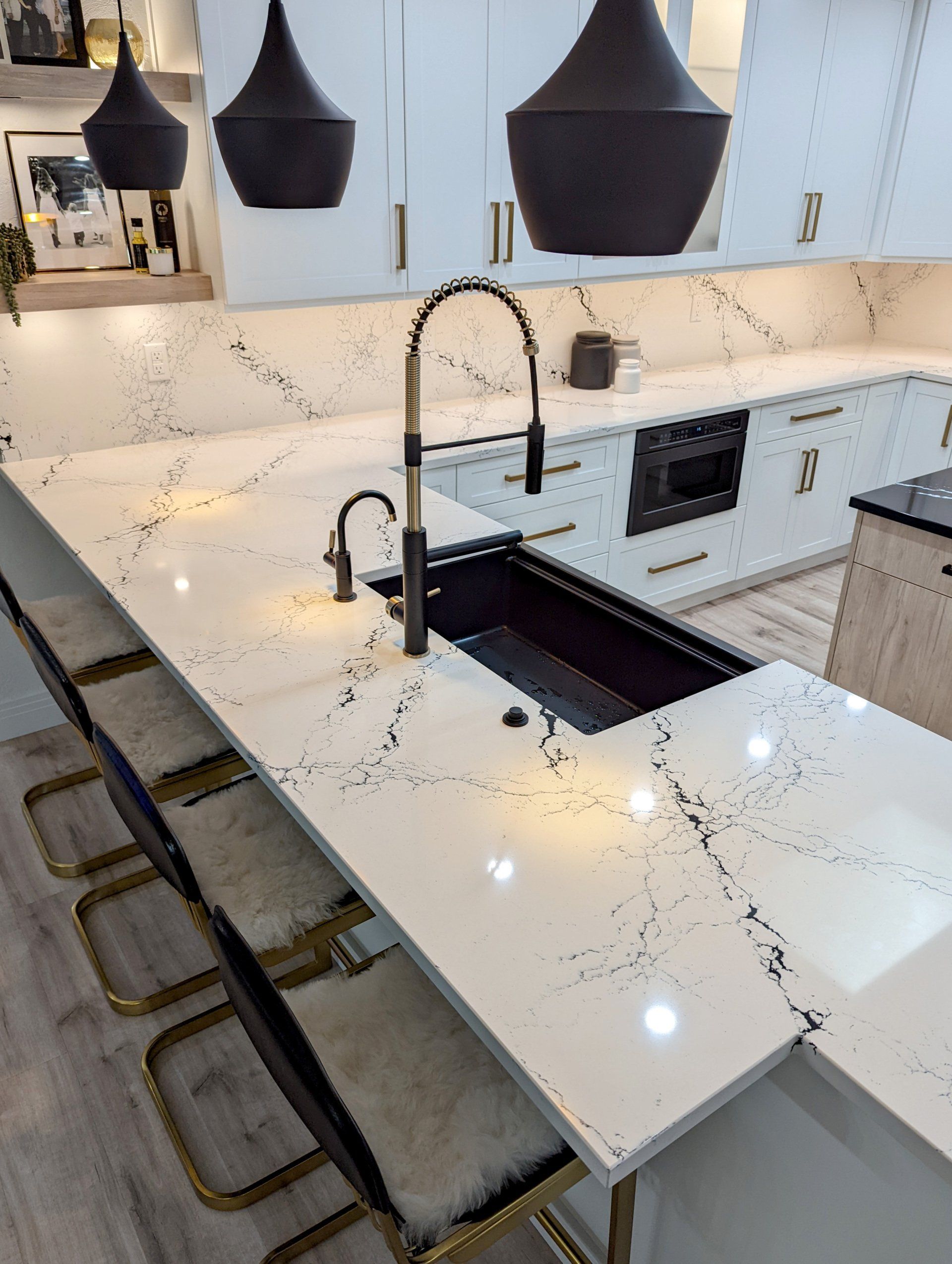 Have a look at one of our most beautiful projects of 2022! This 3-toned modern kitchen features a shaker-style artic white perimeter, mixed with a laminate slab door on the island and bar in Roble (Island) & Inkwell (Bar). The Cambria Quartz Hemsworth countertop features a waterfall edge, full-height backsplash, and a built-in wireless charger. This stunning veined countertop is accented with Cambria's Blackbrook on the island. Matching the countertop is a black Elkay quartz sink and Kraus Artec Pro bronze / matte black faucet. The black and gold theme continues with the Top Knob Sanctuary Modern Metro pulls in flat black and honey bronze. The floating shelves feature lighting from below and above and match the island.