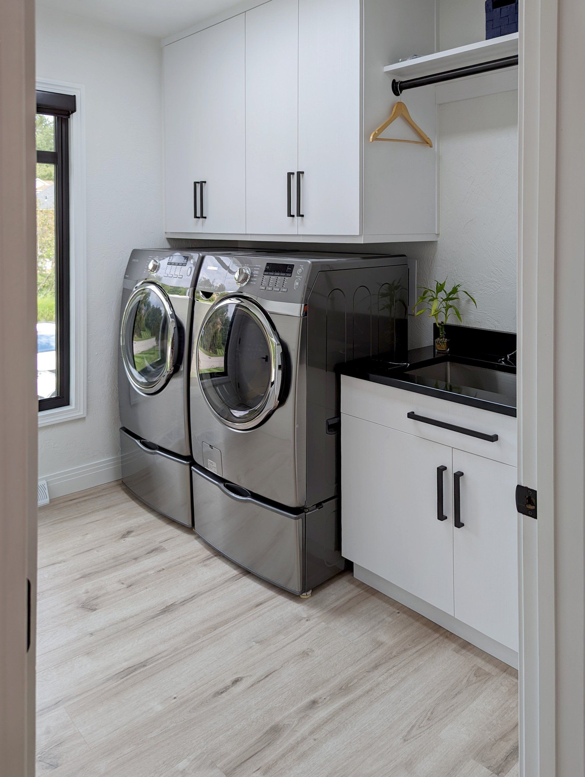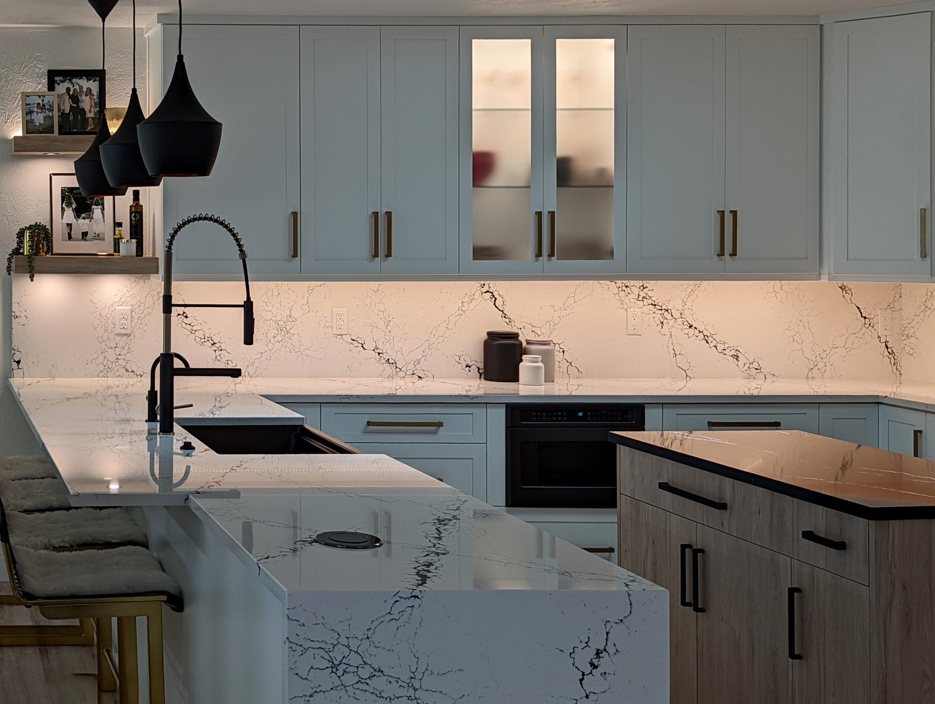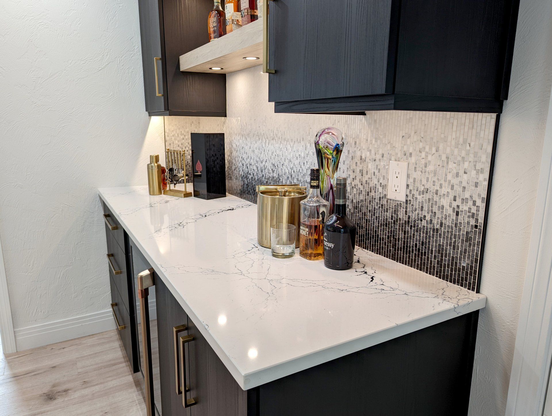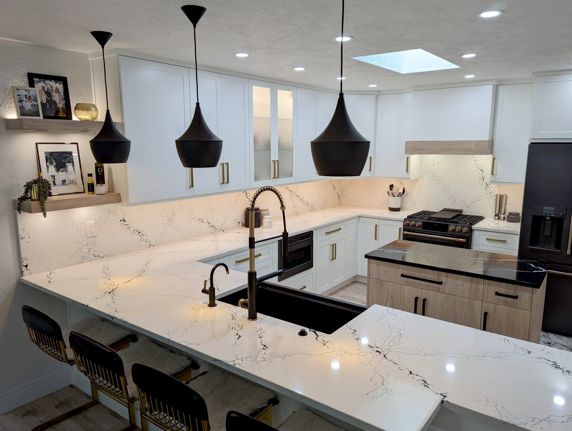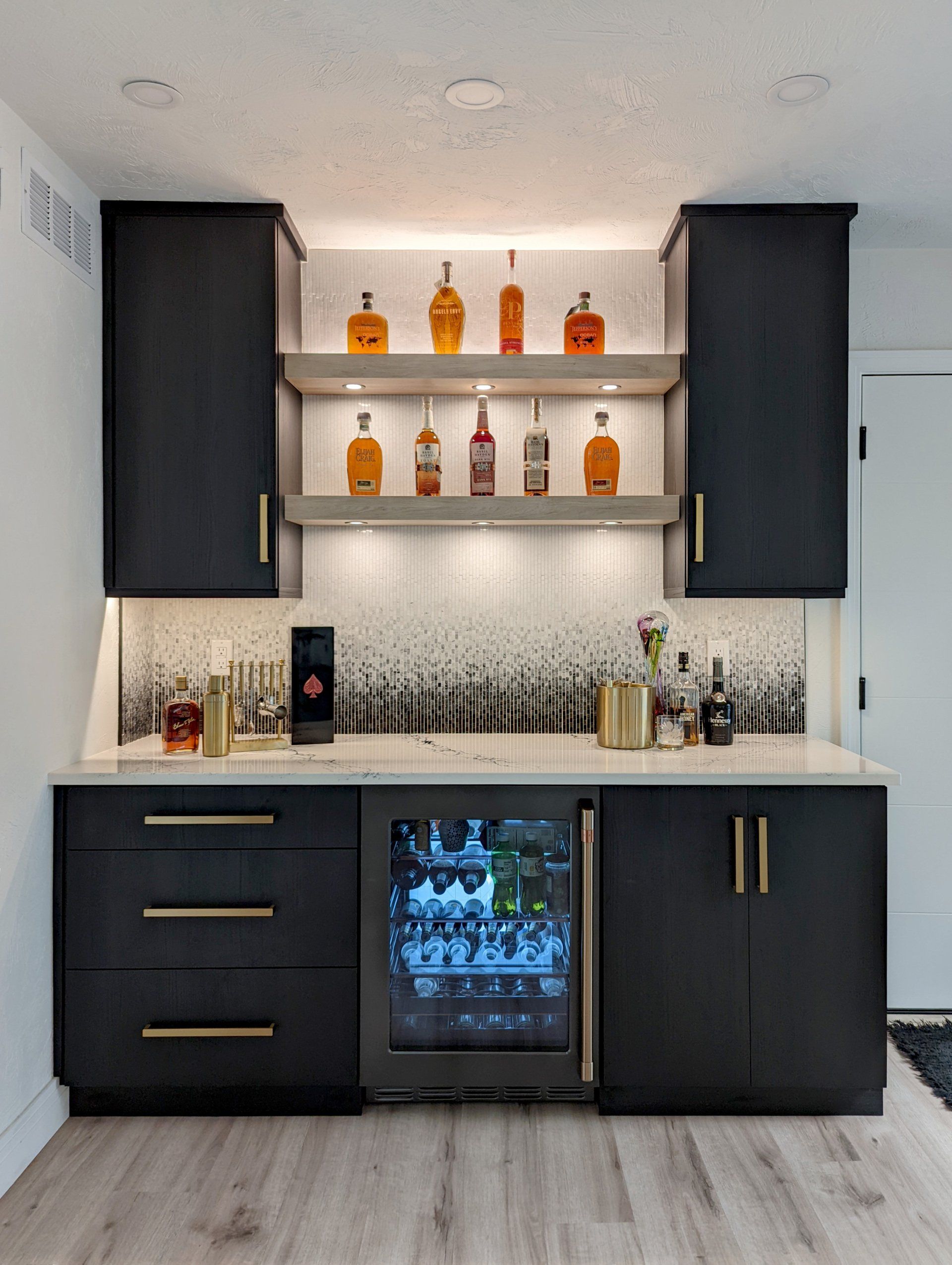 Have a look at one of our most beautiful projects of 2022! This 3-toned modern kitchen features a shaker-style artic white perimeter, mixed with a laminate slab door on the island and bar in Roble (Island) & Inkwell (Bar). The Cambria Quartz Hemsworth countertop features a waterfall edge, full-height backsplash, and a built-in wireless charger. This stunning veined countertop is accented with Cambria's Blackbrook on the island. Matching the countertop is a black Elkay quartz sink and Kraus Artec Pro bronze / matte black faucet. The black and gold theme continues with the Top Knob Sanctuary Modern Metro pulls in flat black and honey bronze. The floating shelves feature lighting from below and above and match the island.